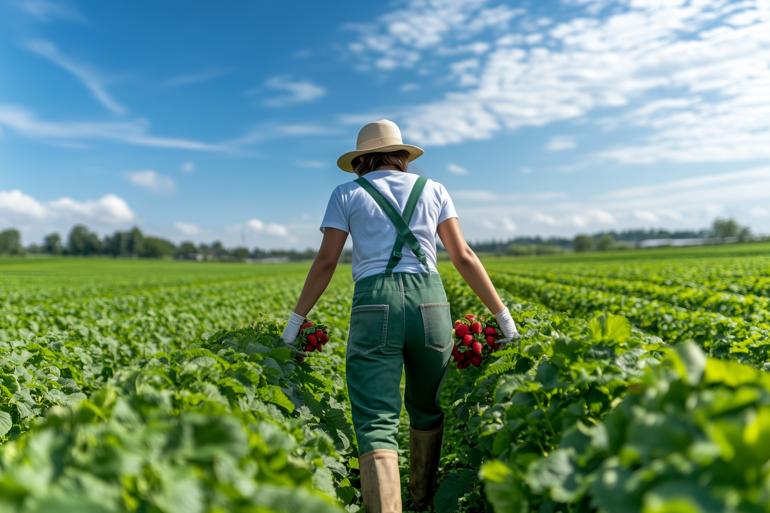 Person in green overalls and hat walks through a lush field, holding strawberries under a bright blue sky.