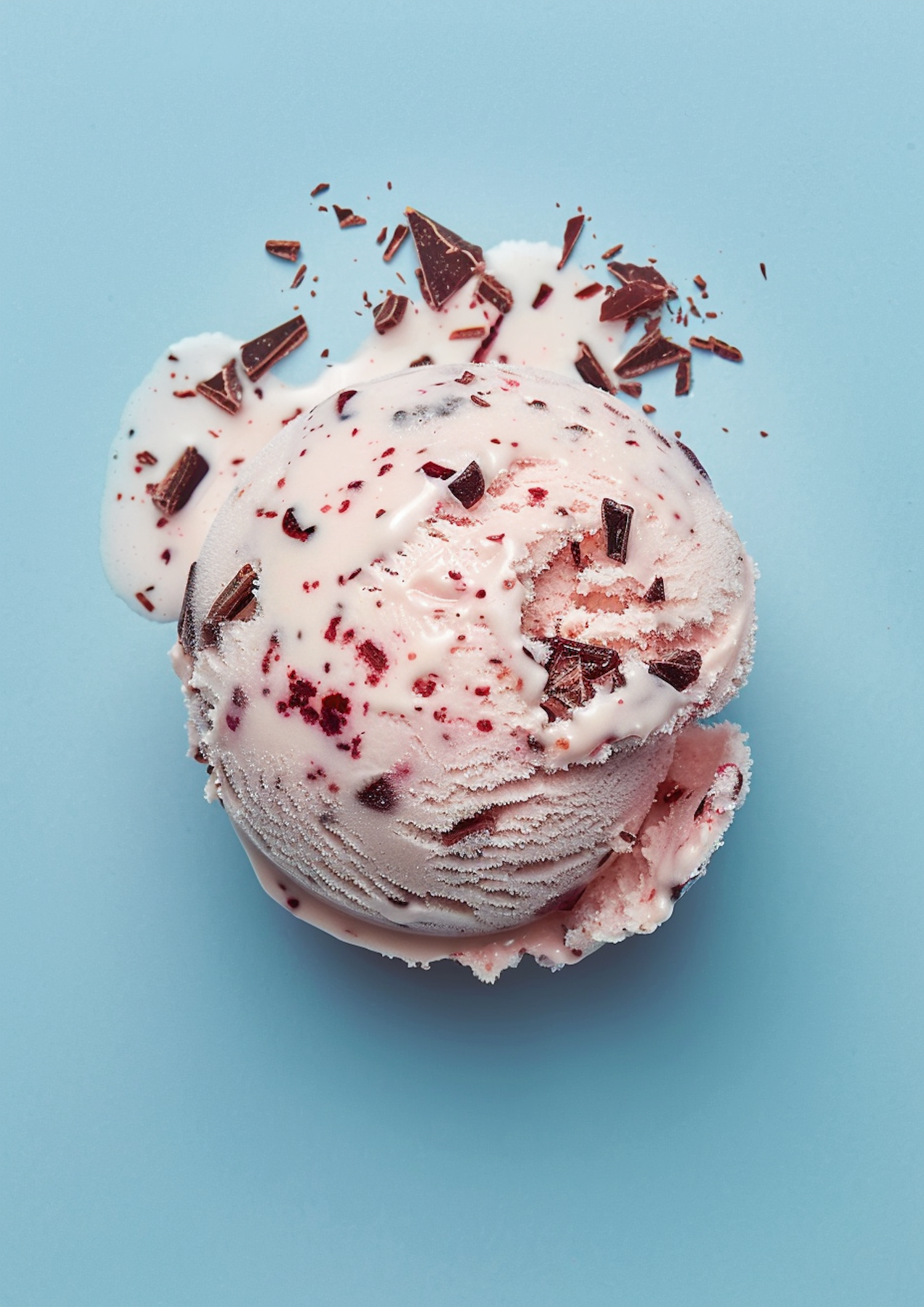 Delicious pink ice cream scoop with berry bits and chocolate shavings on a pastel blue background.