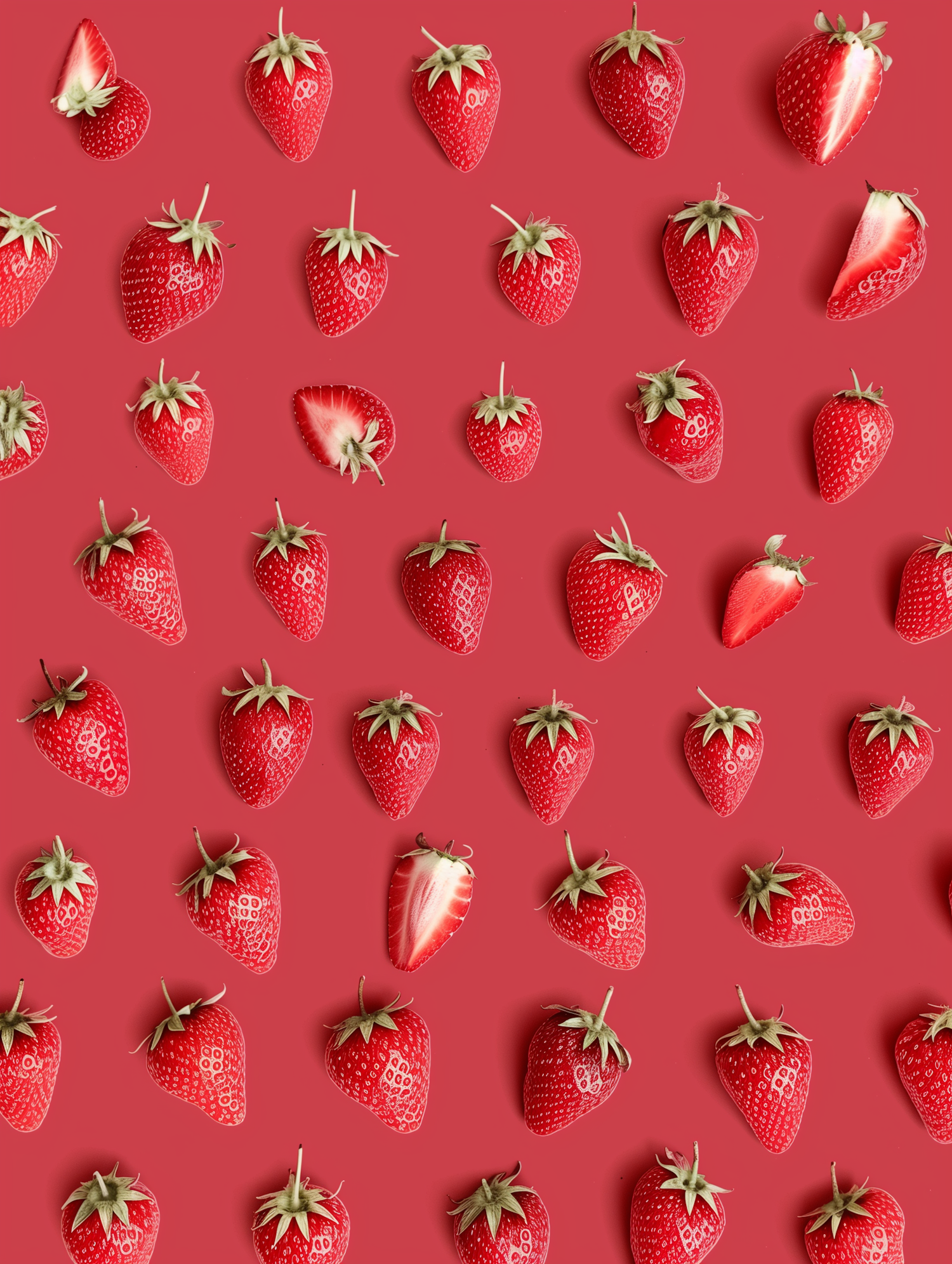 Bright red strawberries arranged in a neat pattern on a matching red background, with some sliced to reveal their juicy interiors.