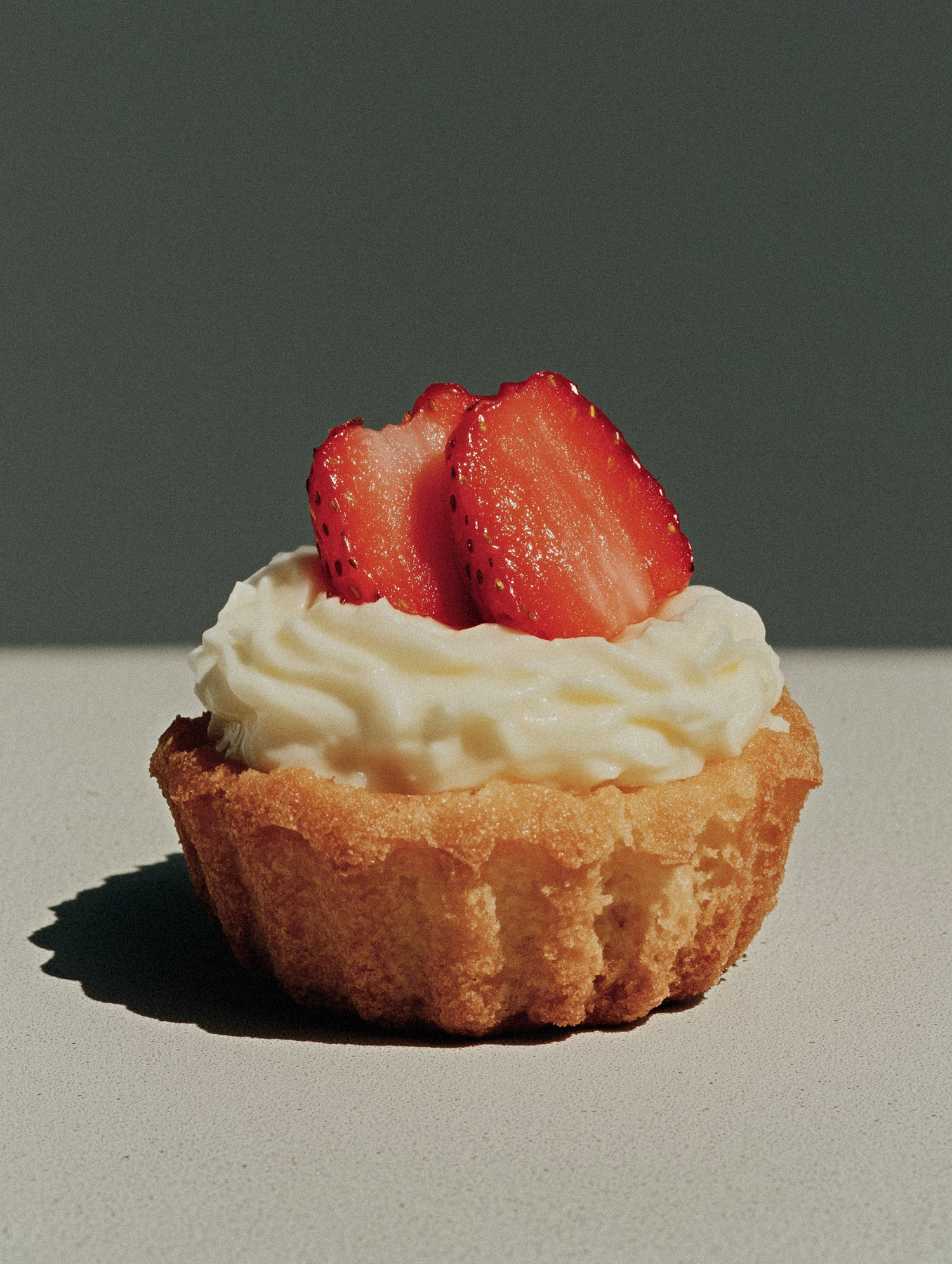 Golden tart with creamy frosting and fresh strawberry slices, perfect for a sweet treat or dessert inspiration.