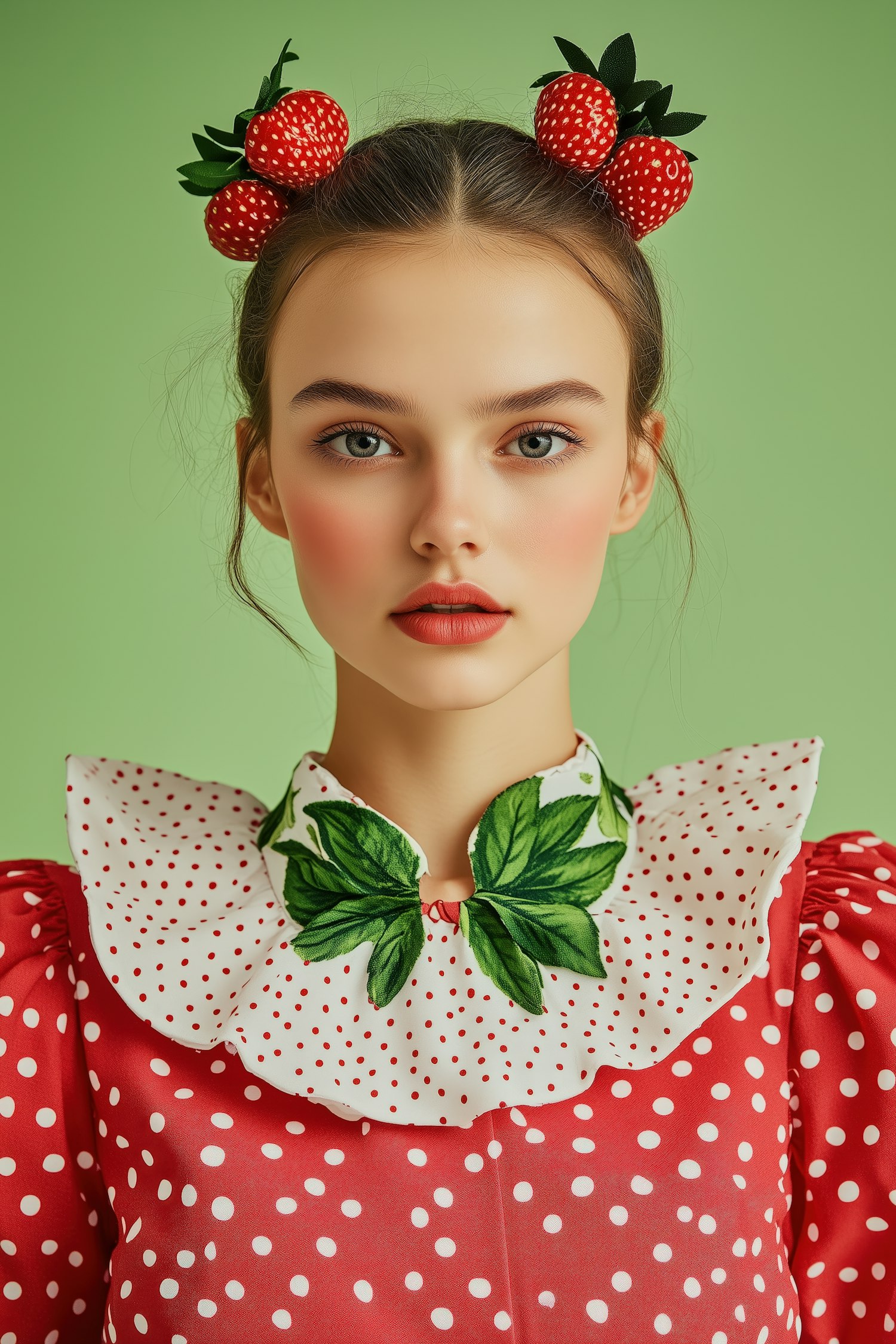 Whimsical strawberry-themed fashion with polka dots, green accents, and playful strawberry hair accessories on a light green backdrop.