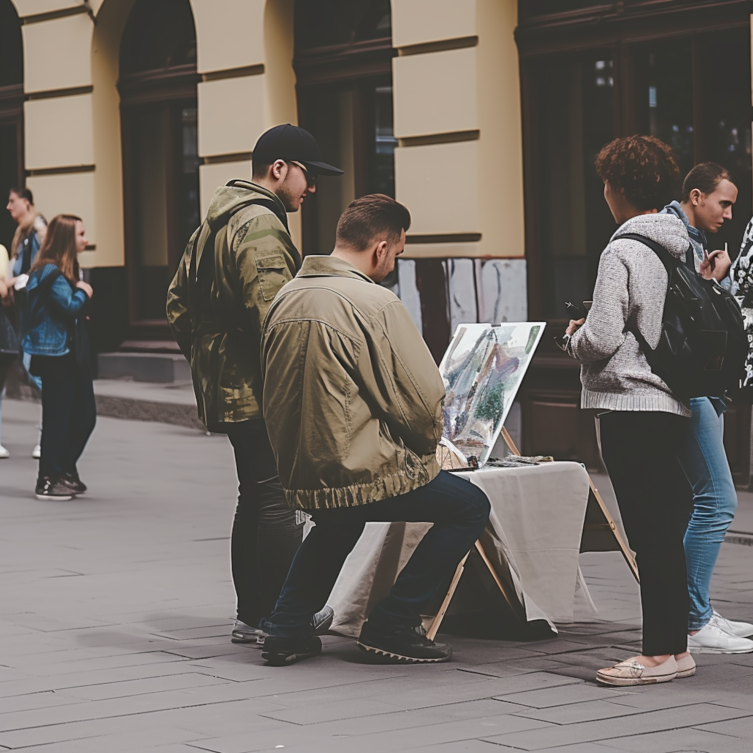 Street artist painting while people gather to watch in an urban setting, creating a lively and artistic atmosphere.