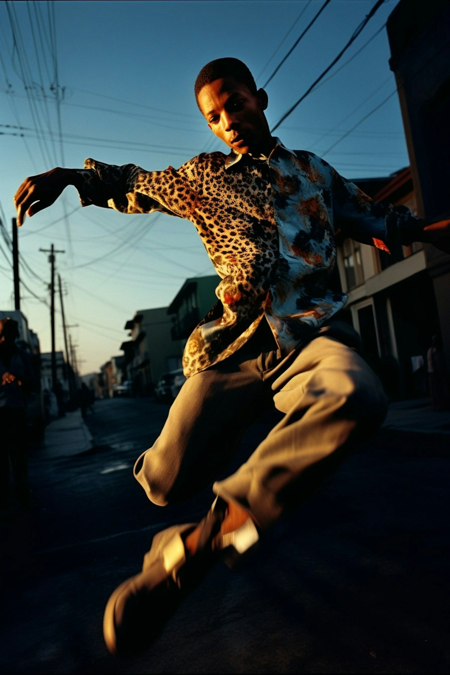 Dynamic shot of a young man in a leopard-print shirt jumping in an urban street at golden hour.