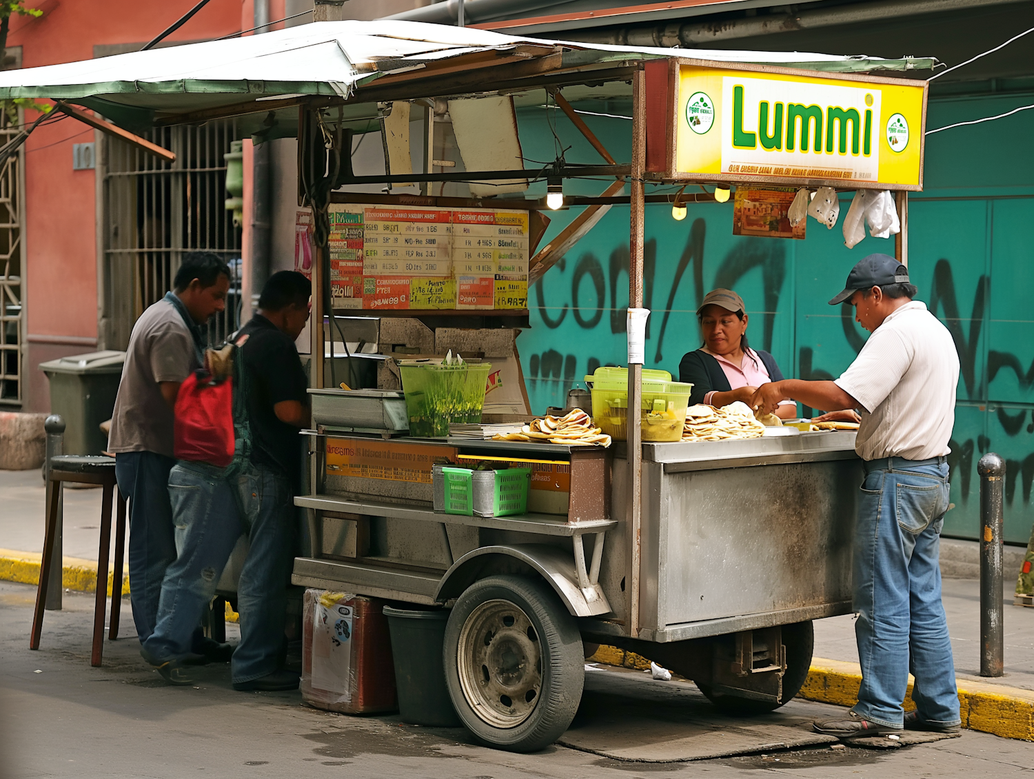 Street food cart with 'Lummi' sign, serving customers in an urban setting. Vibrant scene with people enjoying local cuisine.