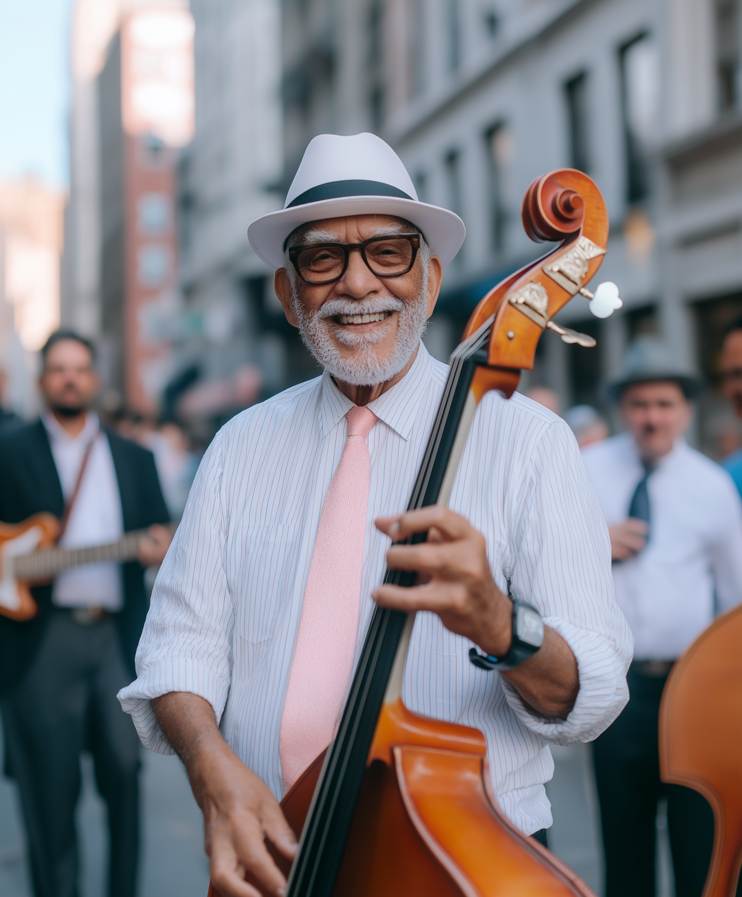 Elderly musician joyfully plays double bass on a lively city street, wearing a white fedora and pink tie, surrounded by fellow performers.