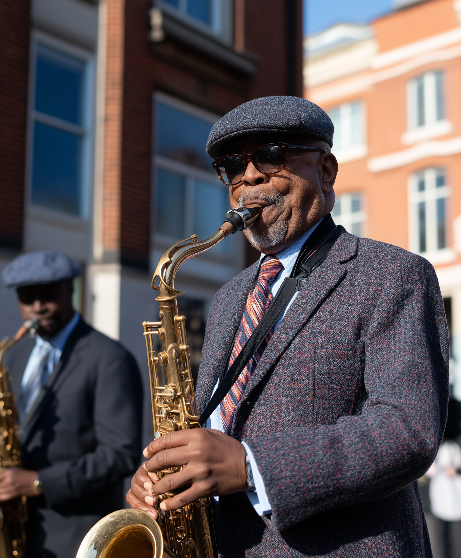 Two musicians in suits play saxophones on a sunny street, exuding jazz vibes with their stylish attire and focused expressions.
