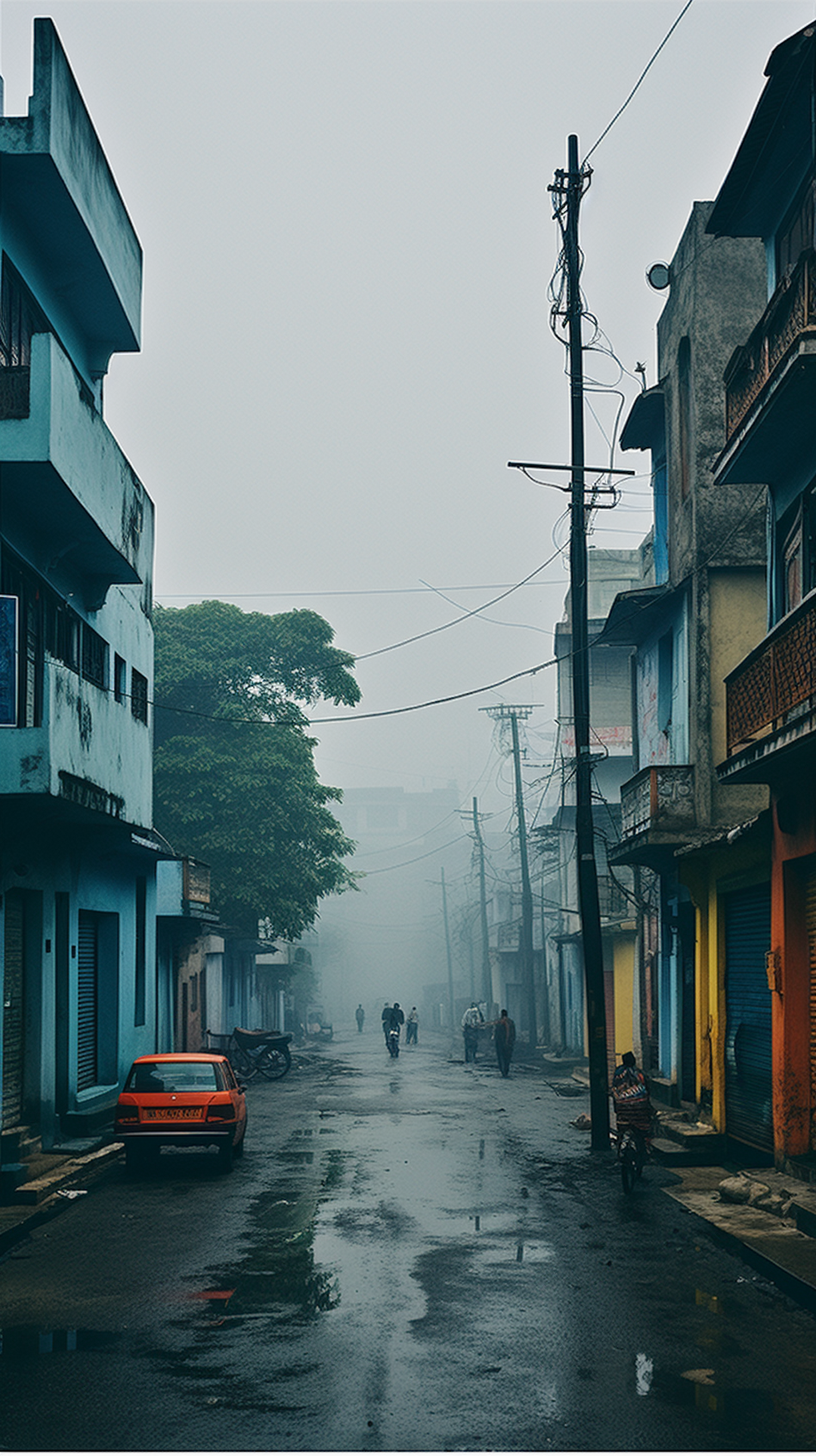 A misty urban street with colorful buildings, wet pavement, and distant figures walking and cycling. An orange car adds a vibrant touch.