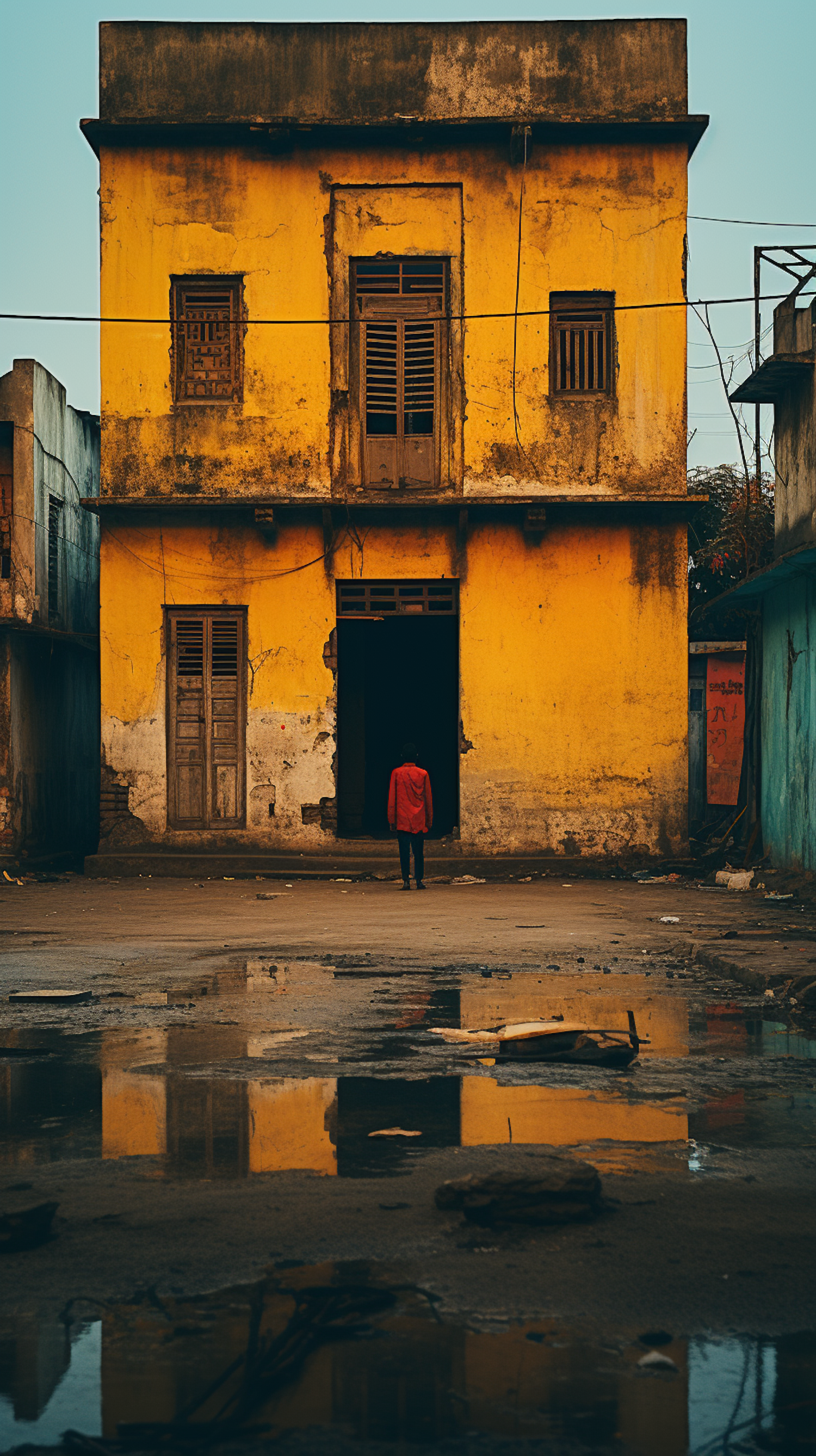 A person in a red jacket stands before a weathered yellow building, with reflections in puddles creating a striking visual contrast.