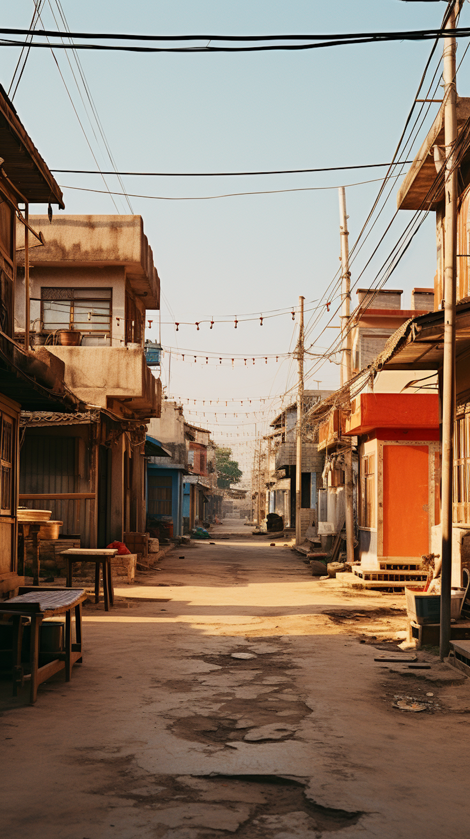 Deserted street with old buildings, vibrant colors, and crisscrossing wires under warm sunlight, creating an urban, nostalgic atmosphere.