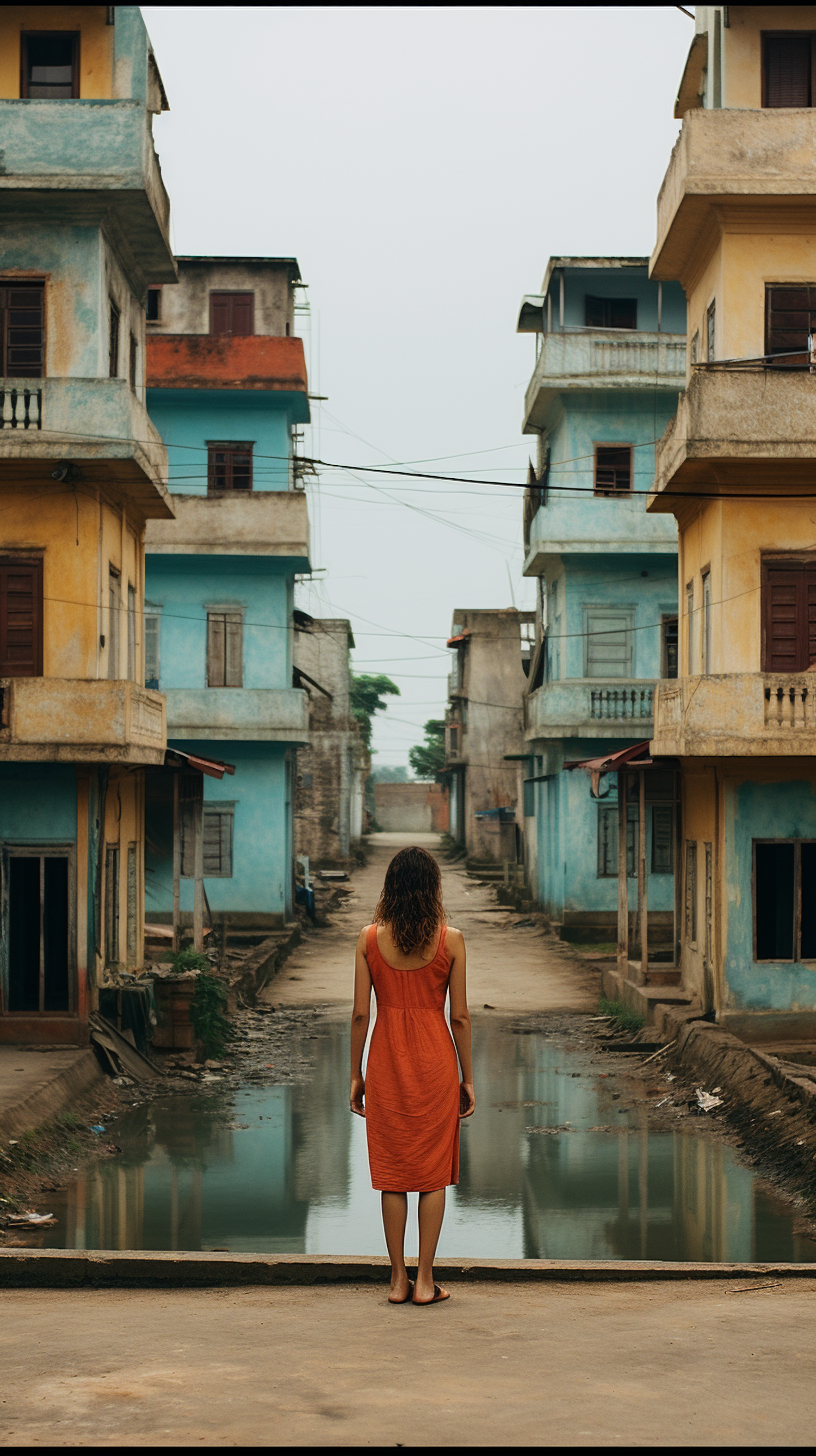 Woman in orange dress stands before colorful, weathered buildings on a flooded street, evoking solitude and contemplation.