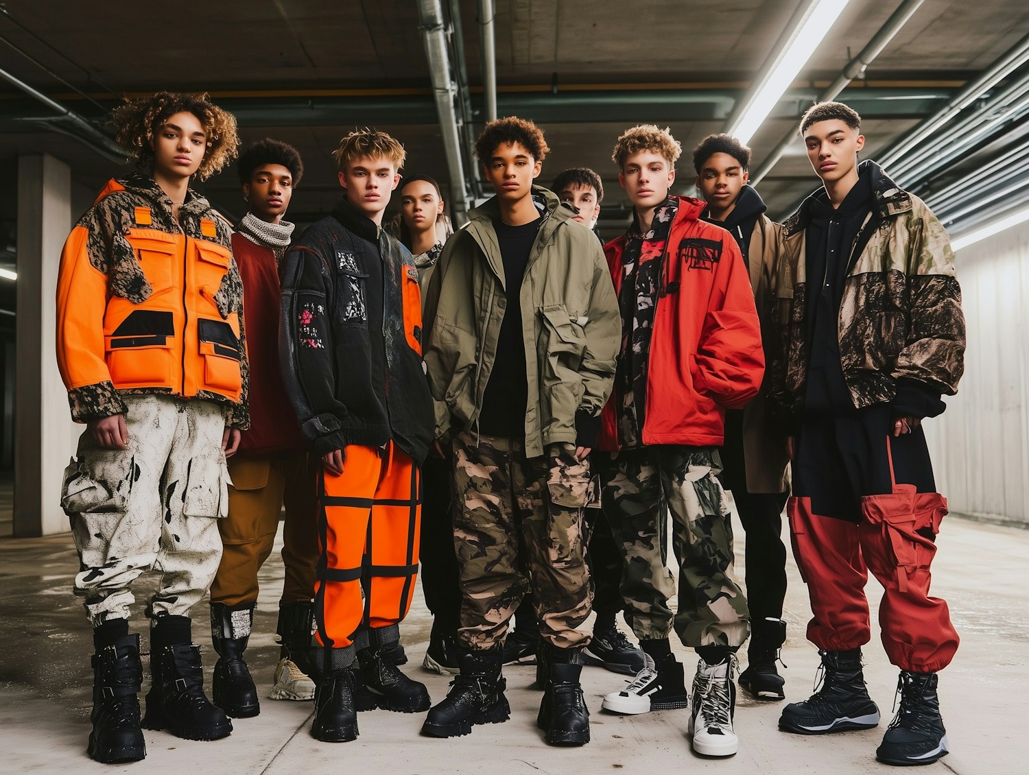 A stylish group of young men in bold streetwear with vibrant colors, cargo pants, and boots, set in an industrial urban backdrop.
