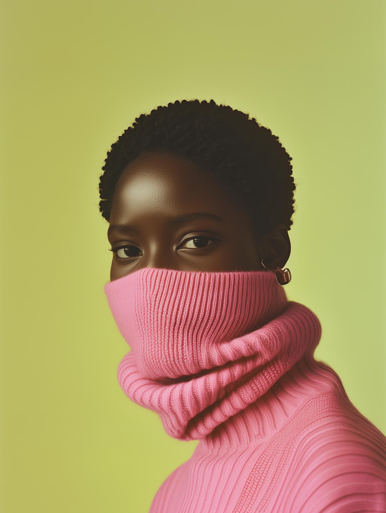 Stylish portrait of a woman in a pink turtleneck against a yellow background, highlighting fashion and color contrast.