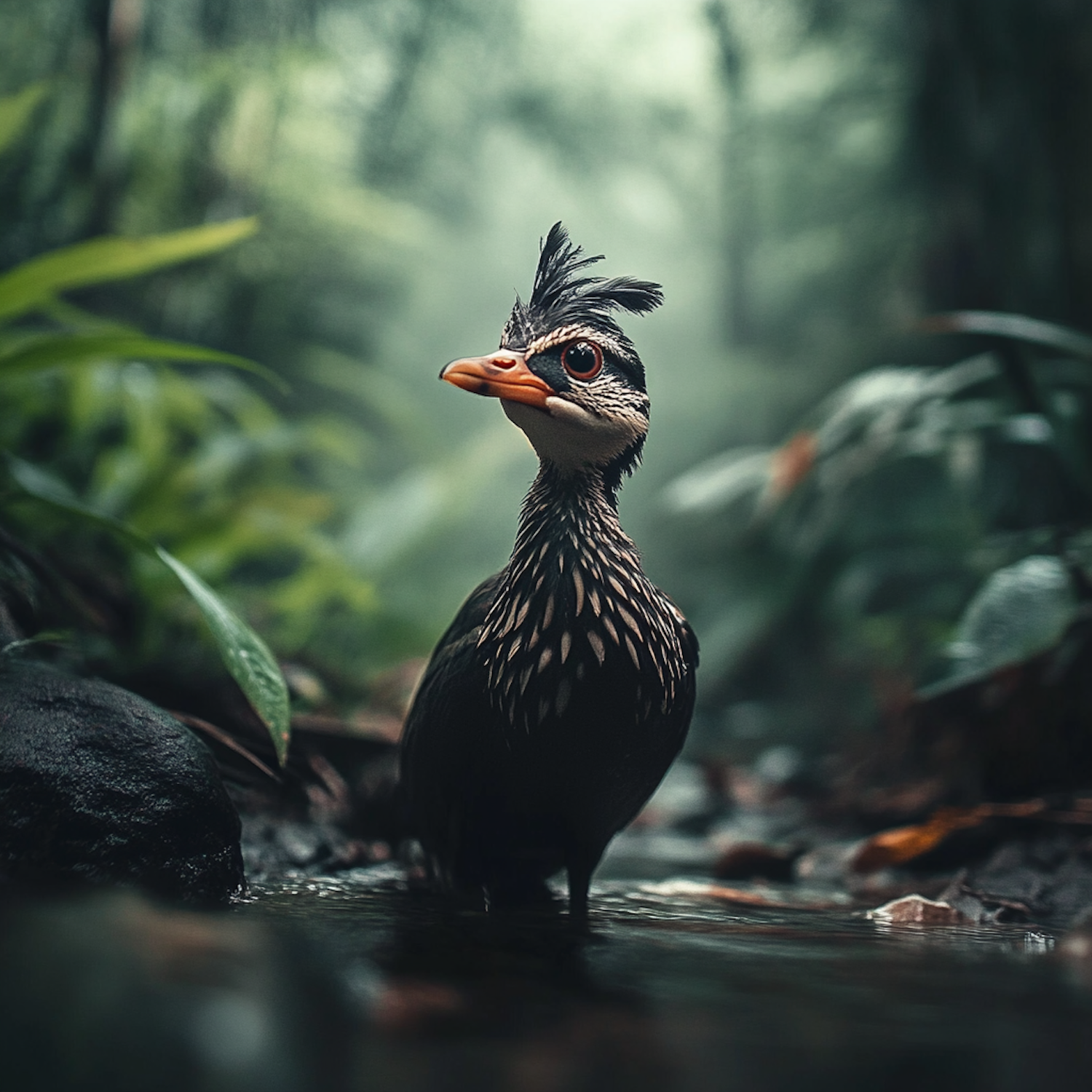 A unique bird with a crest stands in a lush, green forest stream, showcasing its striking black and white plumage and vibrant orange beak.