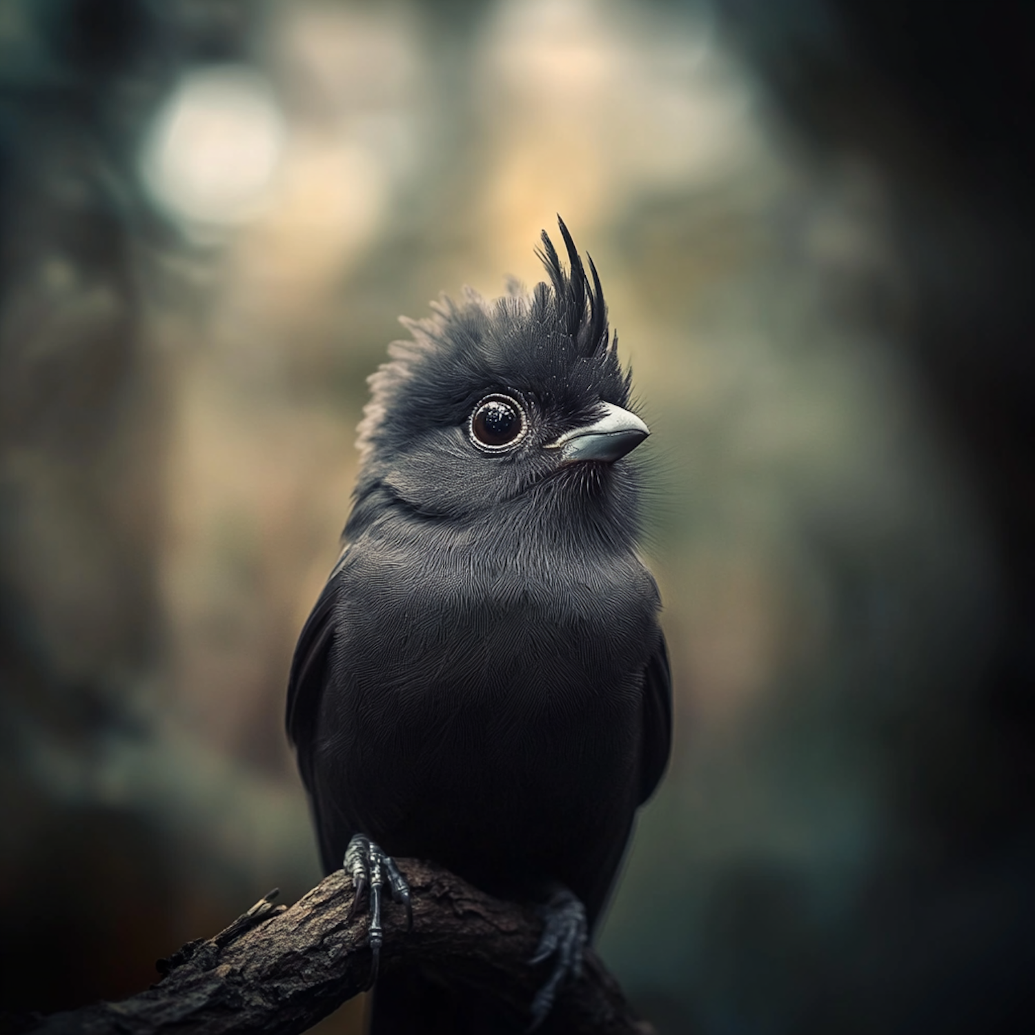 A small, dark-feathered bird with a crest sits on a branch, set against a blurred forest background.