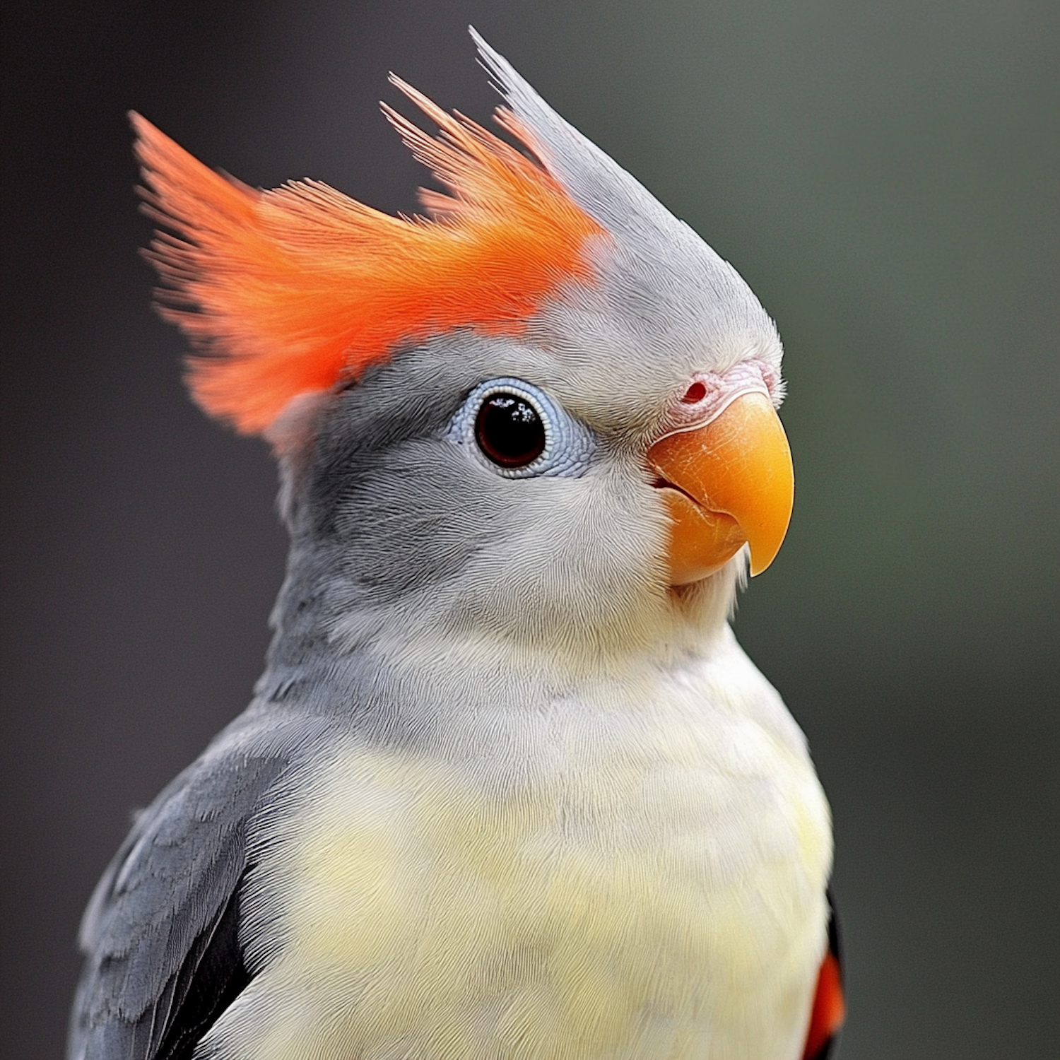 Vibrant cockatiel with a striking orange crest and gray-yellow plumage, set against a blurred background.