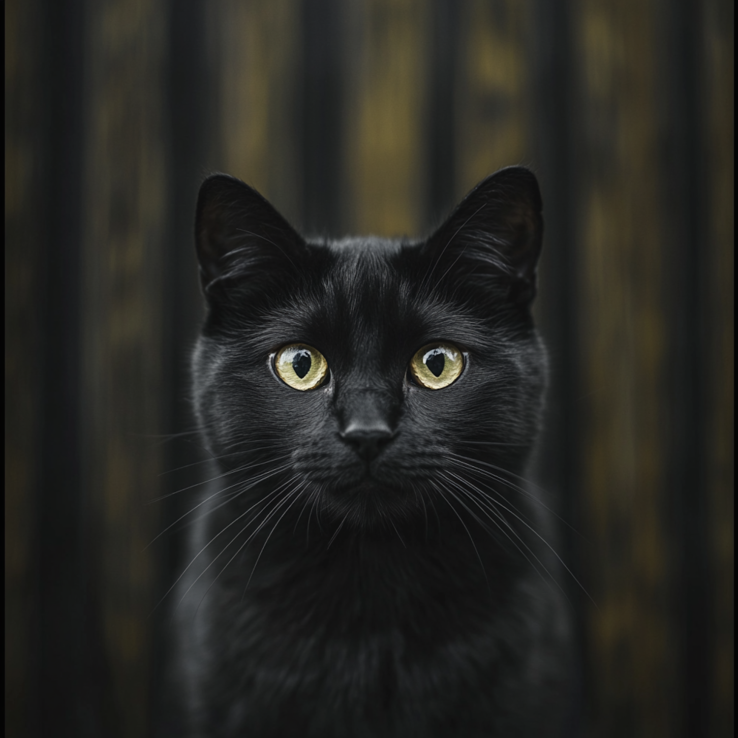 Elegant black cat with striking yellow-green eyes against a dark wooden background, exuding mystery and charm.