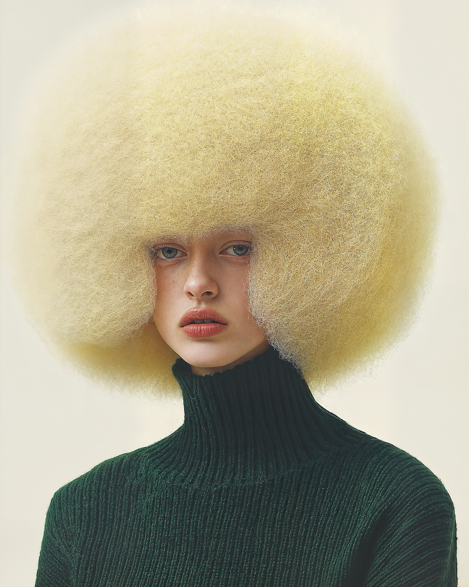 Person with a large blonde afro and green turtleneck, set against a pale background, showcasing a striking fashion look.