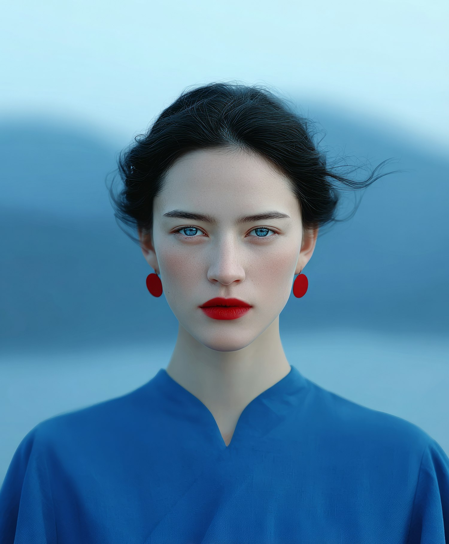 A striking portrait of a woman with blue eyes, red earrings, and a blue top, set against a soft blue background.