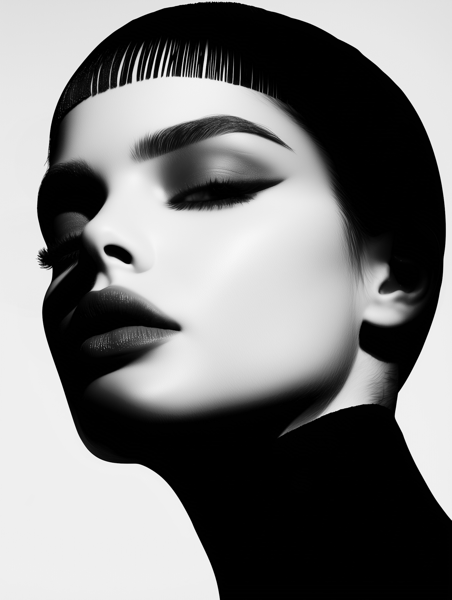 Dramatic black and white portrait with geometric hairstyle and bold eyeliner, highlighting facial contours and shadows.