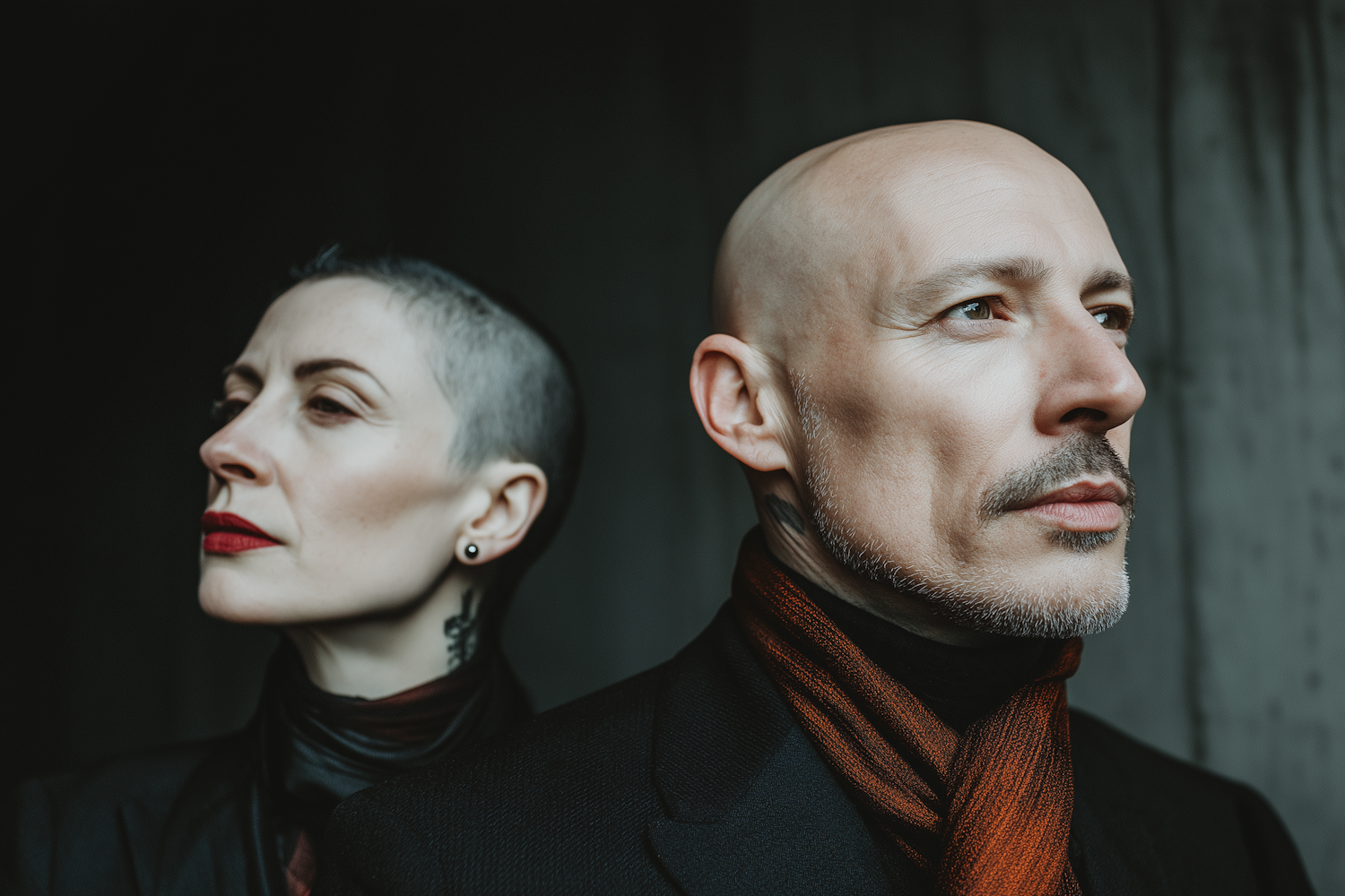 A striking portrait of two individuals with bold styles, gazing in opposite directions against a dark background.