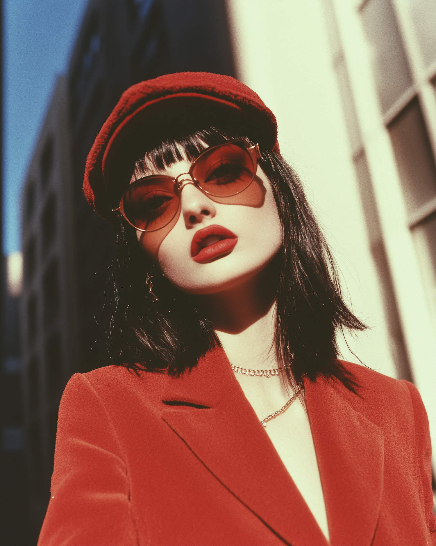 Chic woman in red outfit and sunglasses poses in urban setting, exuding confidence and style with bold colors and striking fashion.