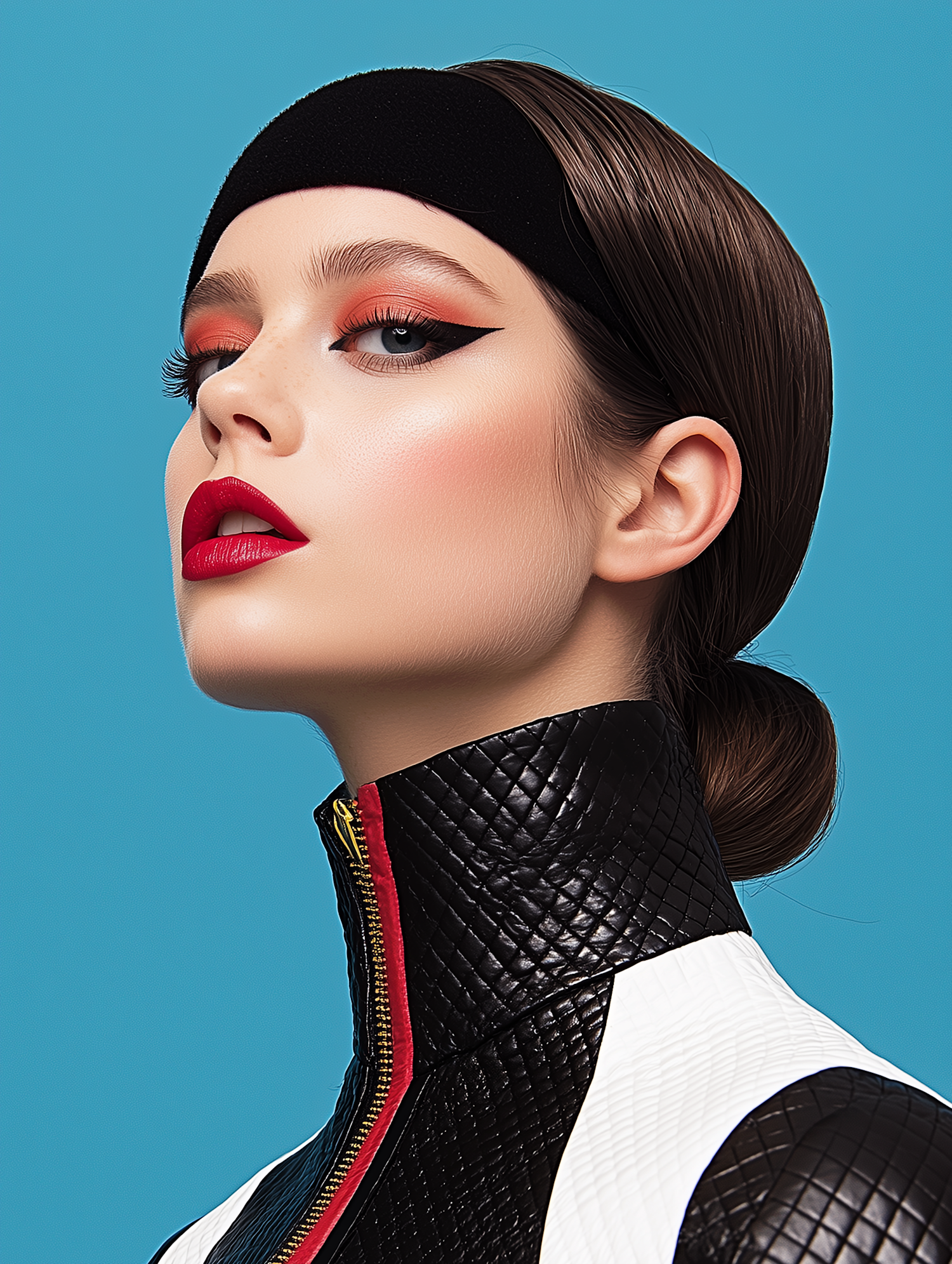 Bold makeup and fashion portrait with striking eyeliner, red lips, and a quilted jacket against a bright blue background.
