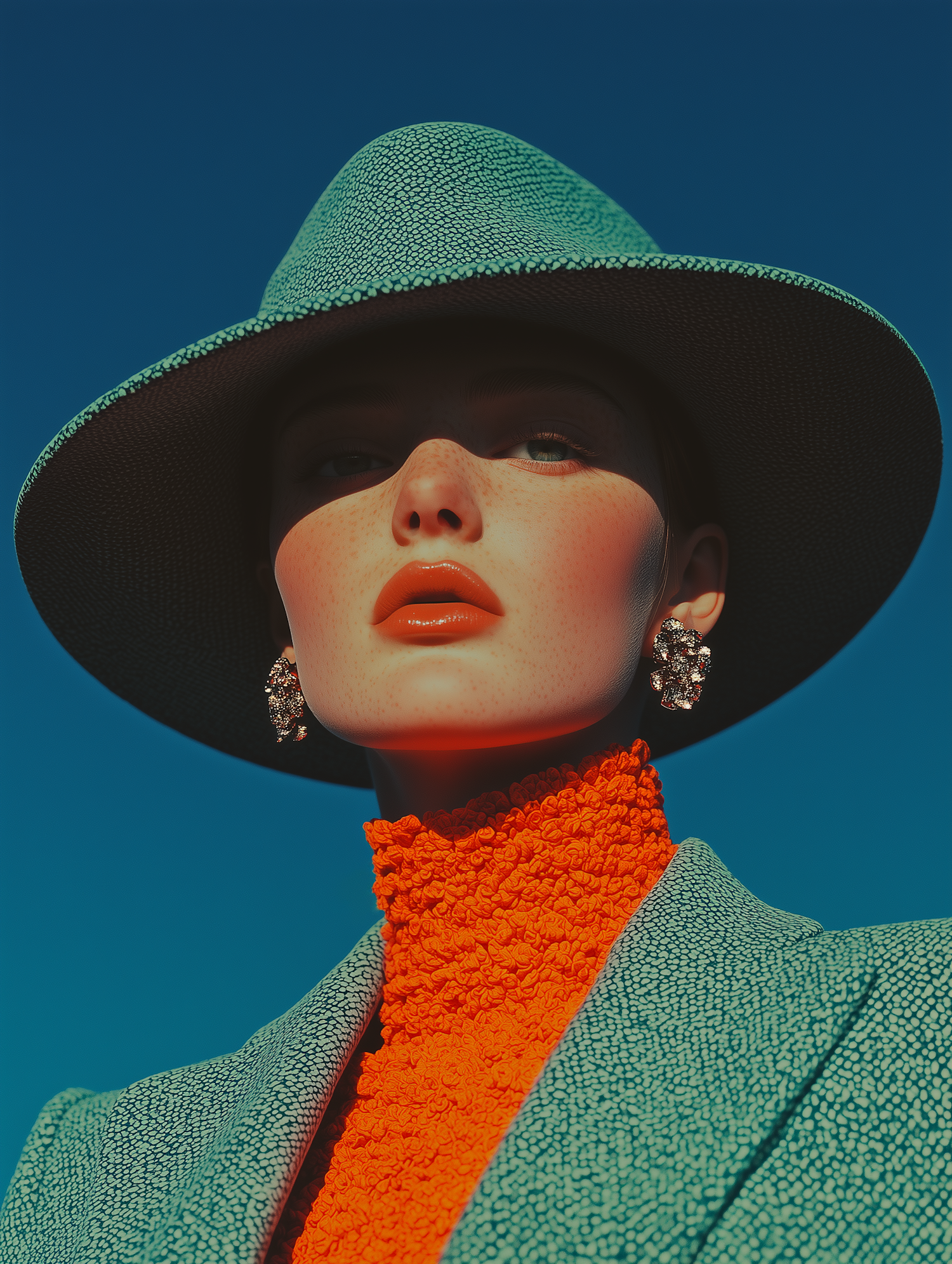 Vibrant portrait of a woman in a teal hat and orange top against a blue sky, showcasing bold fashion and striking colors.