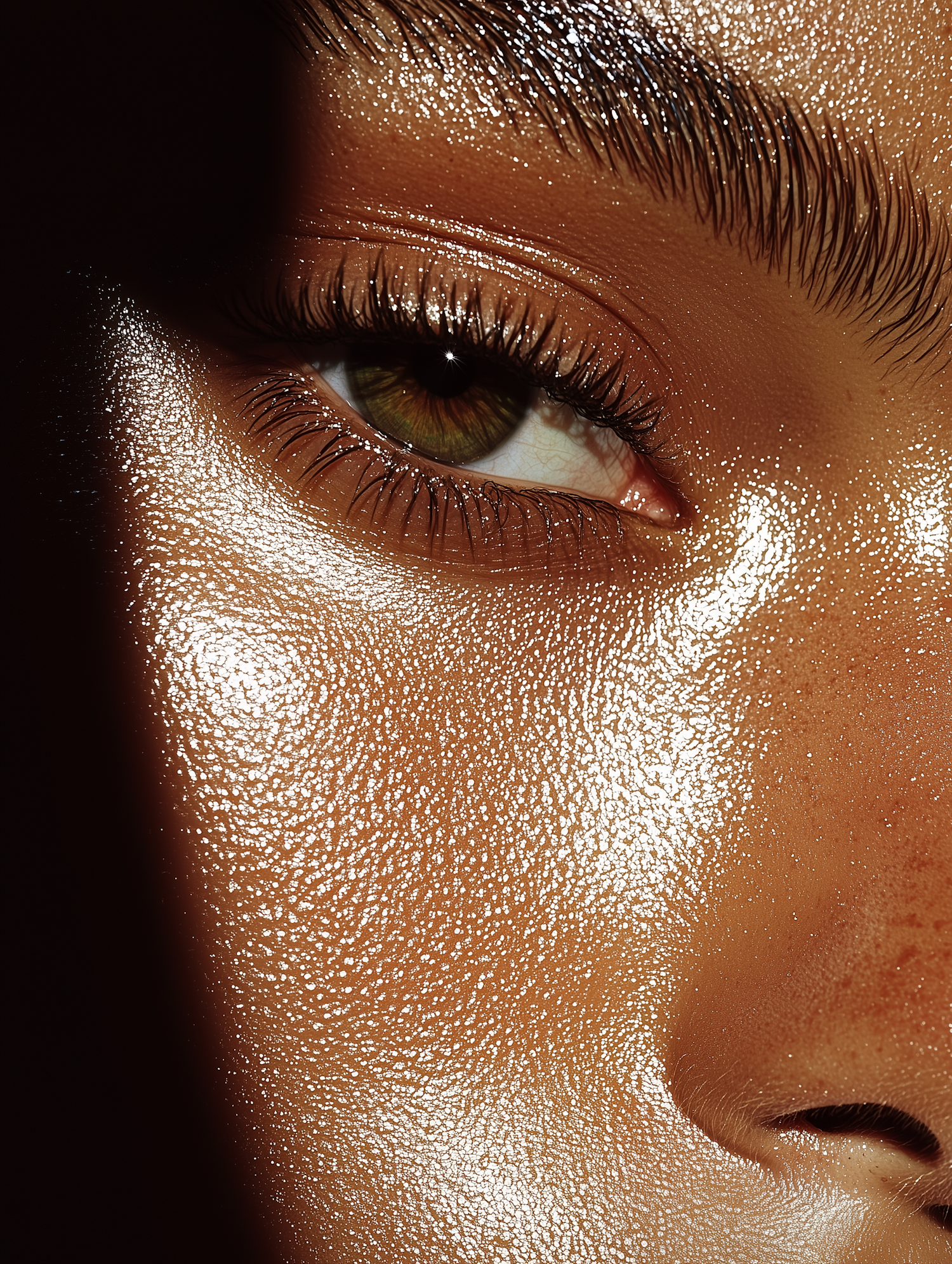 Close-up of a brown eye with glossy skin, highlighting detailed textures and reflections. Warm tones and shadows create depth.