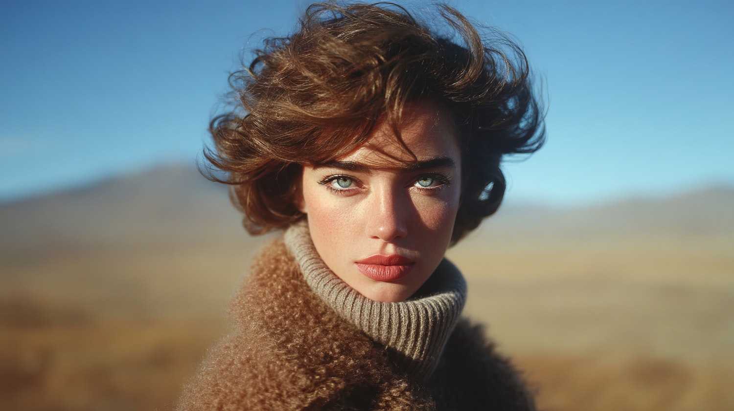 Close-up portrait of a person with green eyes and wavy brown hair, wearing a brown coat, set against a blurred outdoor background.