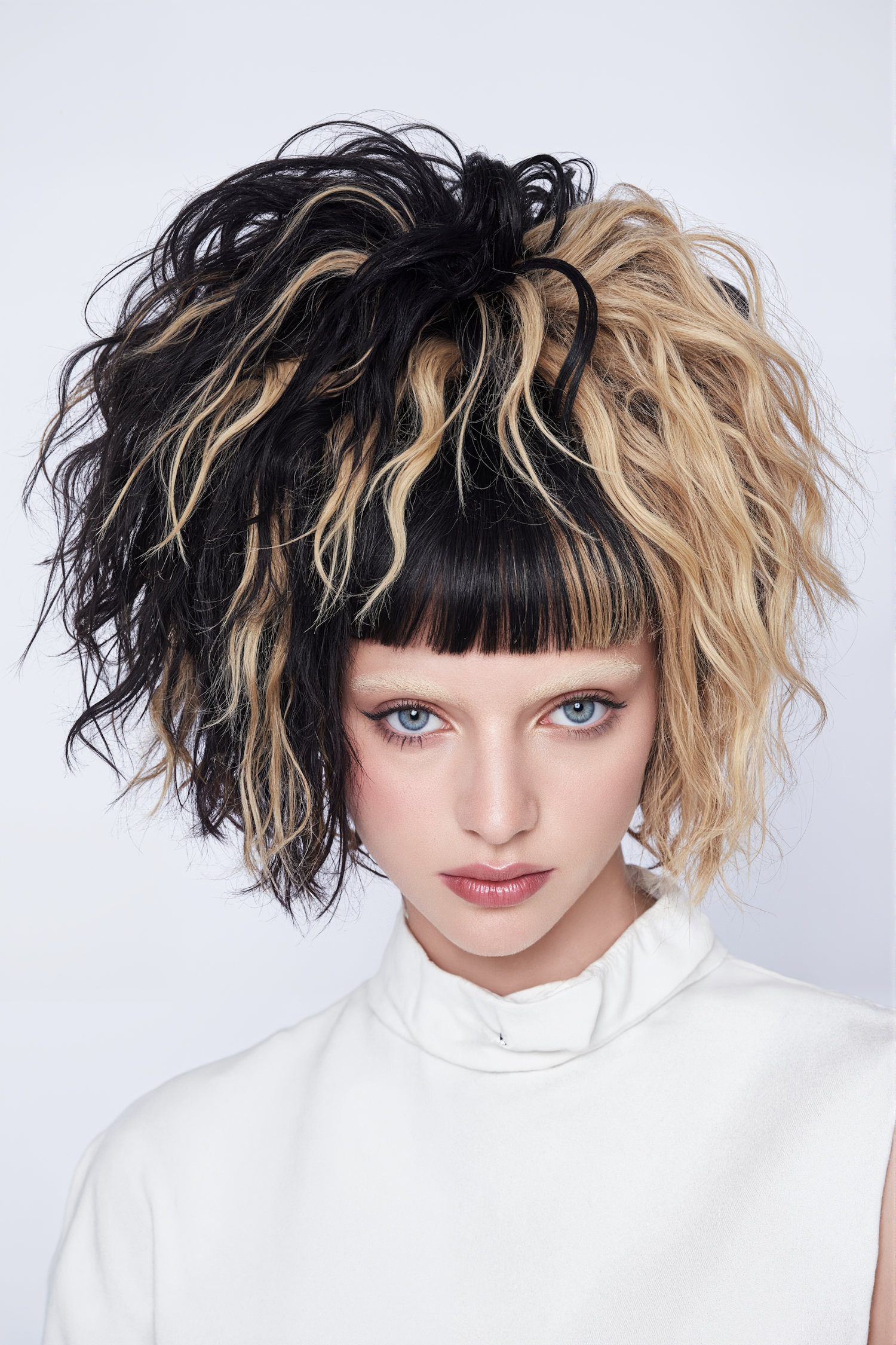 Woman with striking two-tone hair, black and blonde, styled in a voluminous bob. Blue eyes and minimalist white top complete the edgy look.