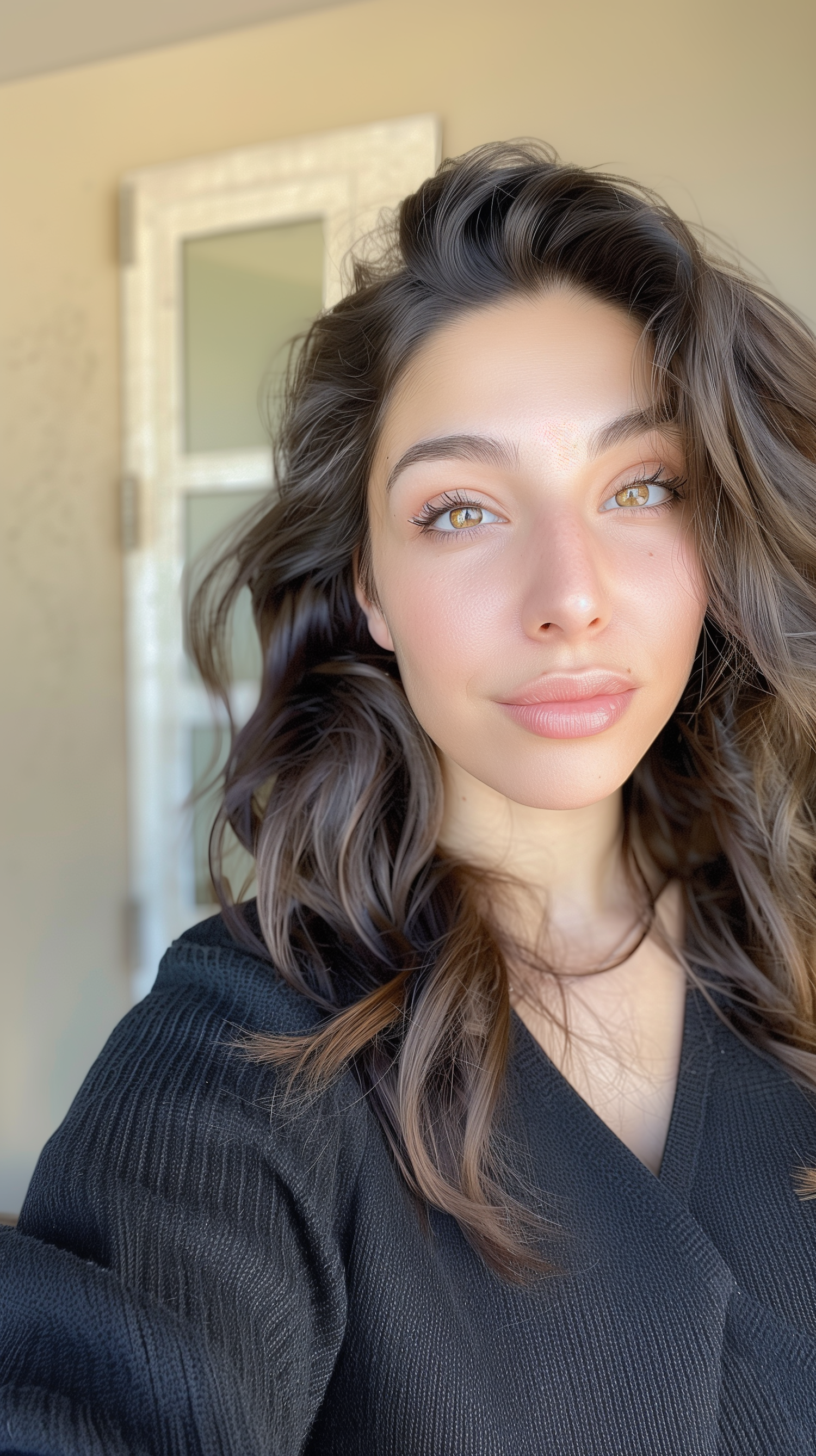 Close-up portrait of a young woman with wavy brown hair and hazel eyes, wearing a black sweater in soft natural light.