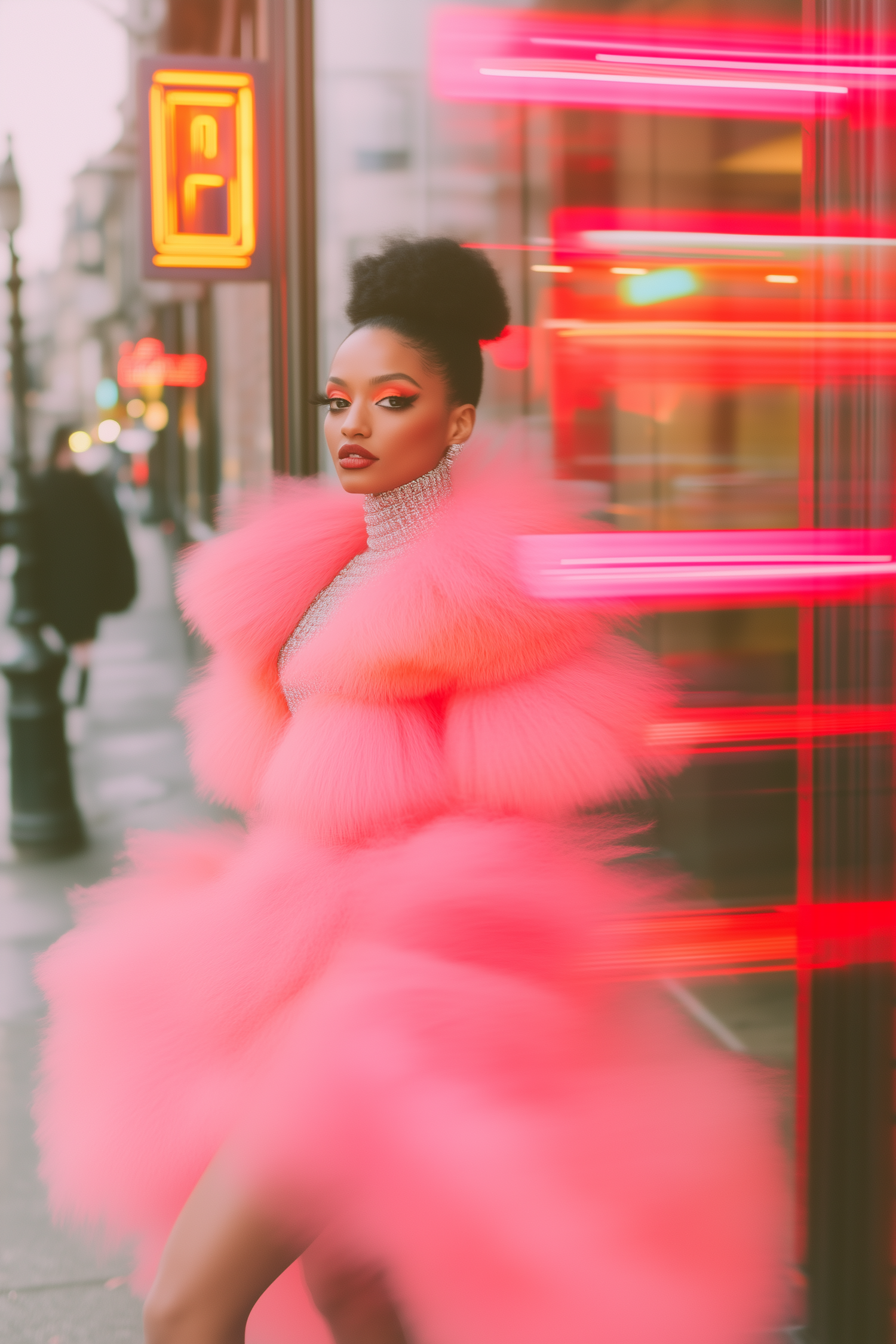 Stylish woman in a vibrant pink fur coat with neon lights in the background, exuding confidence and modern elegance.