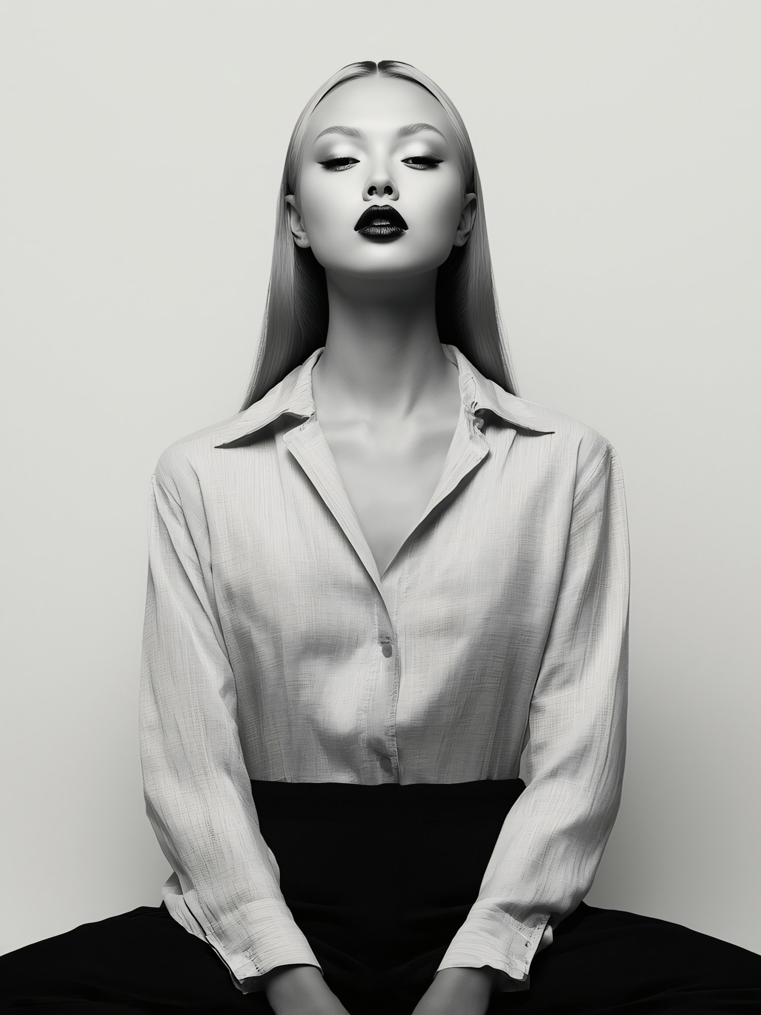 Monochromatic portrait of a person with sleek hair, bold makeup, and a confident pose, wearing a light shirt and dark trousers.