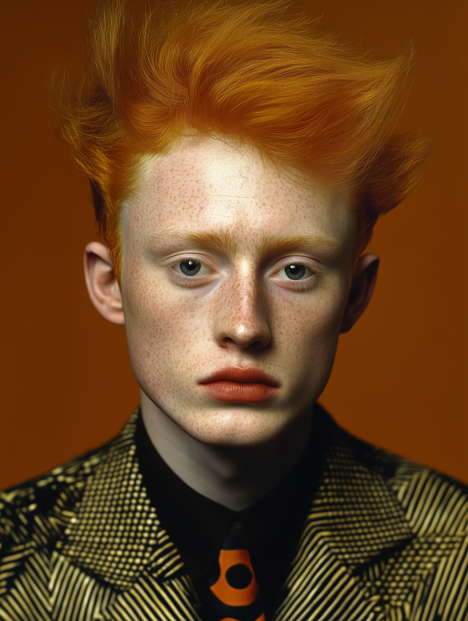Young man with striking orange hair and freckles, wearing a patterned suit and orange tie, set against an orange background.