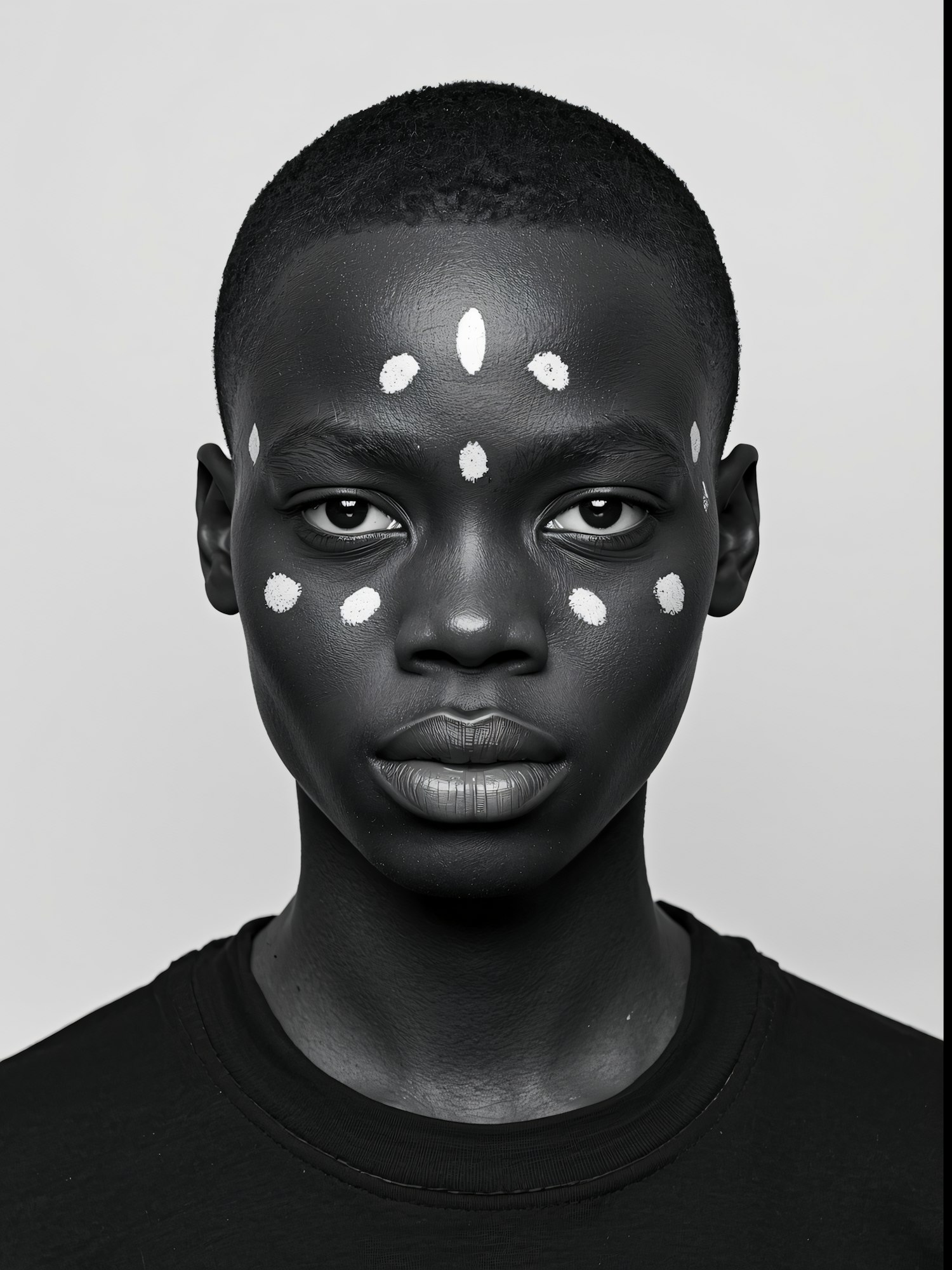 A striking portrait of a person with white face paint patterns on dark skin, set against a neutral background, emphasizing their features.