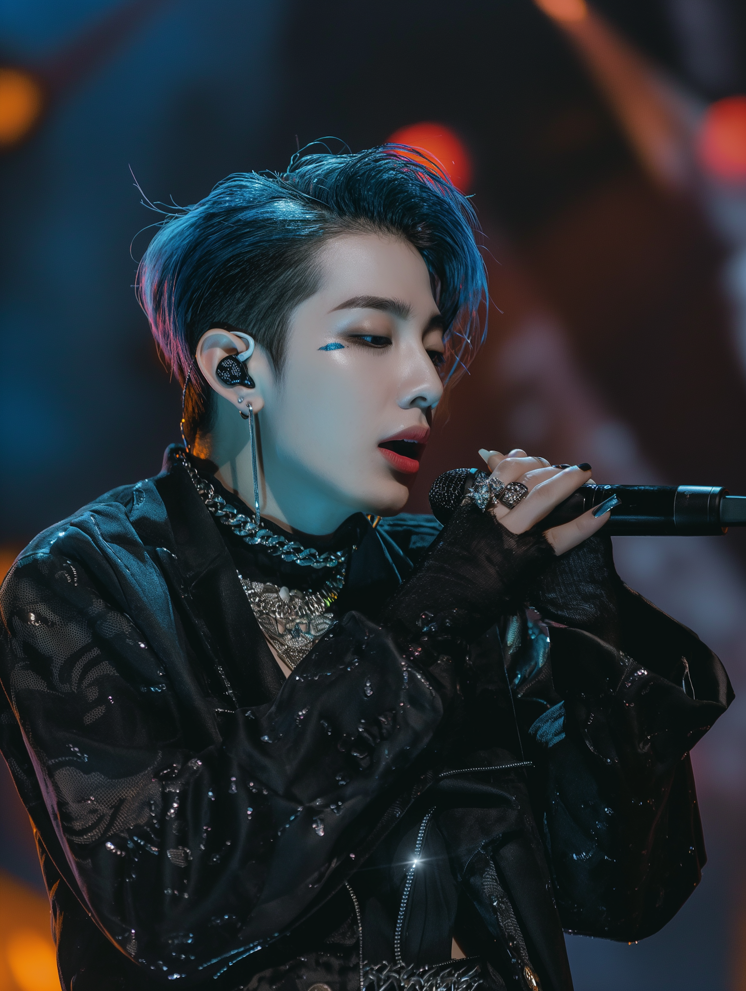 Asian male performer with blue hair and bold makeup sings passionately on stage, wearing a shimmering black outfit and ornate accessories.