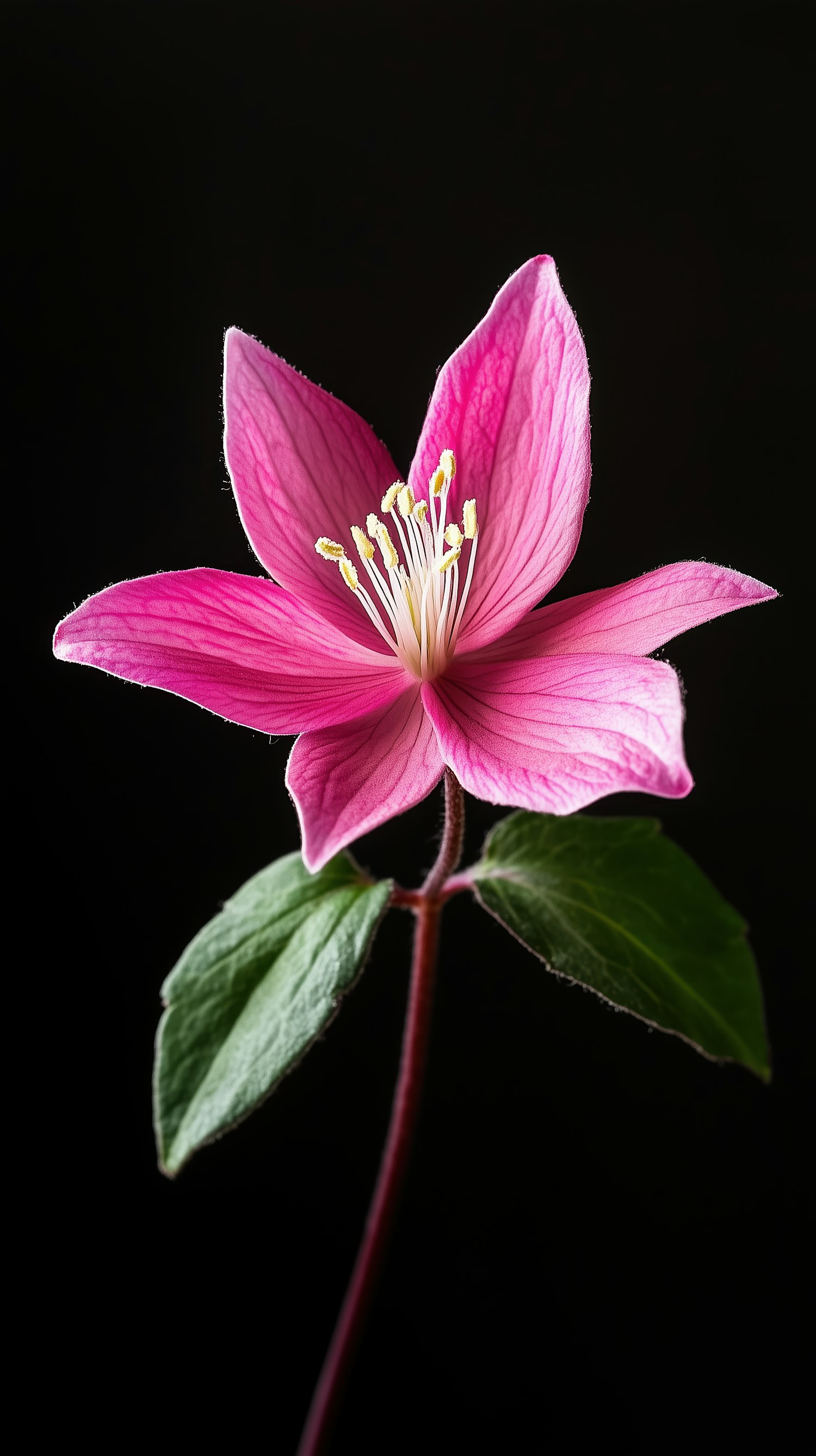 Vibrant pink flower with veined petals and yellow-tipped stamens against a dark background, highlighting its elegance and simplicity.