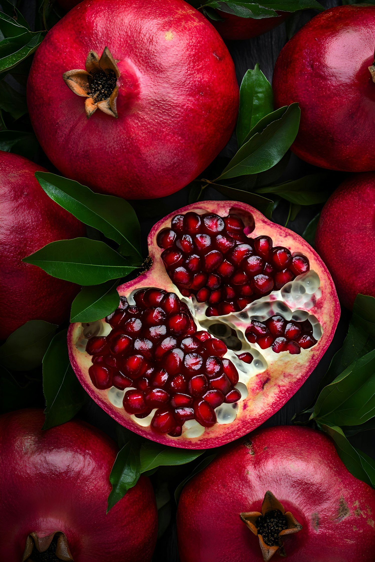 Vibrant pomegranates with glistening seeds and lush green leaves create a striking, appetizing composition.