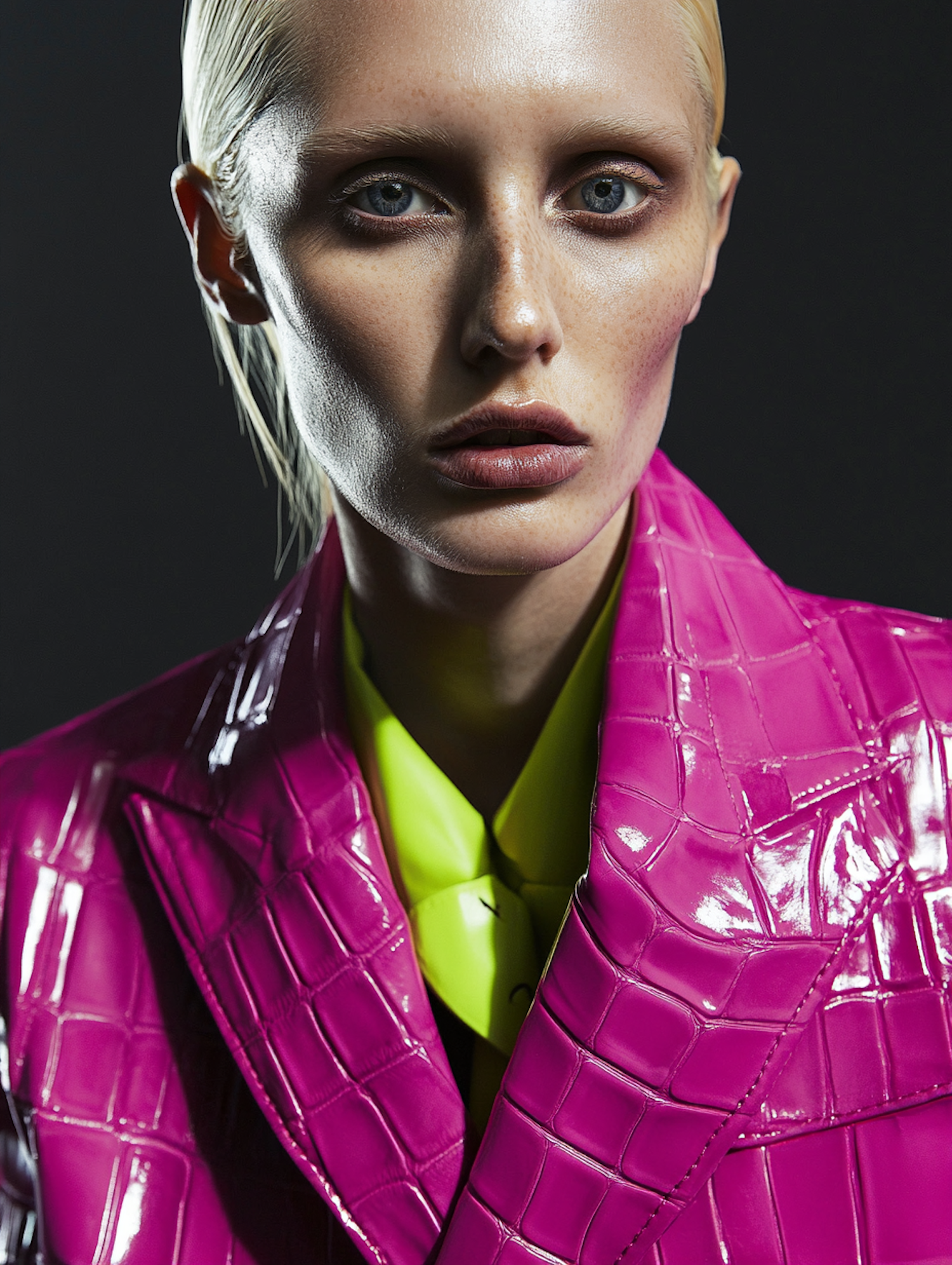Close-up of a woman in a glossy magenta jacket and neon yellow shirt, with slicked-back blonde hair and piercing blue eyes.