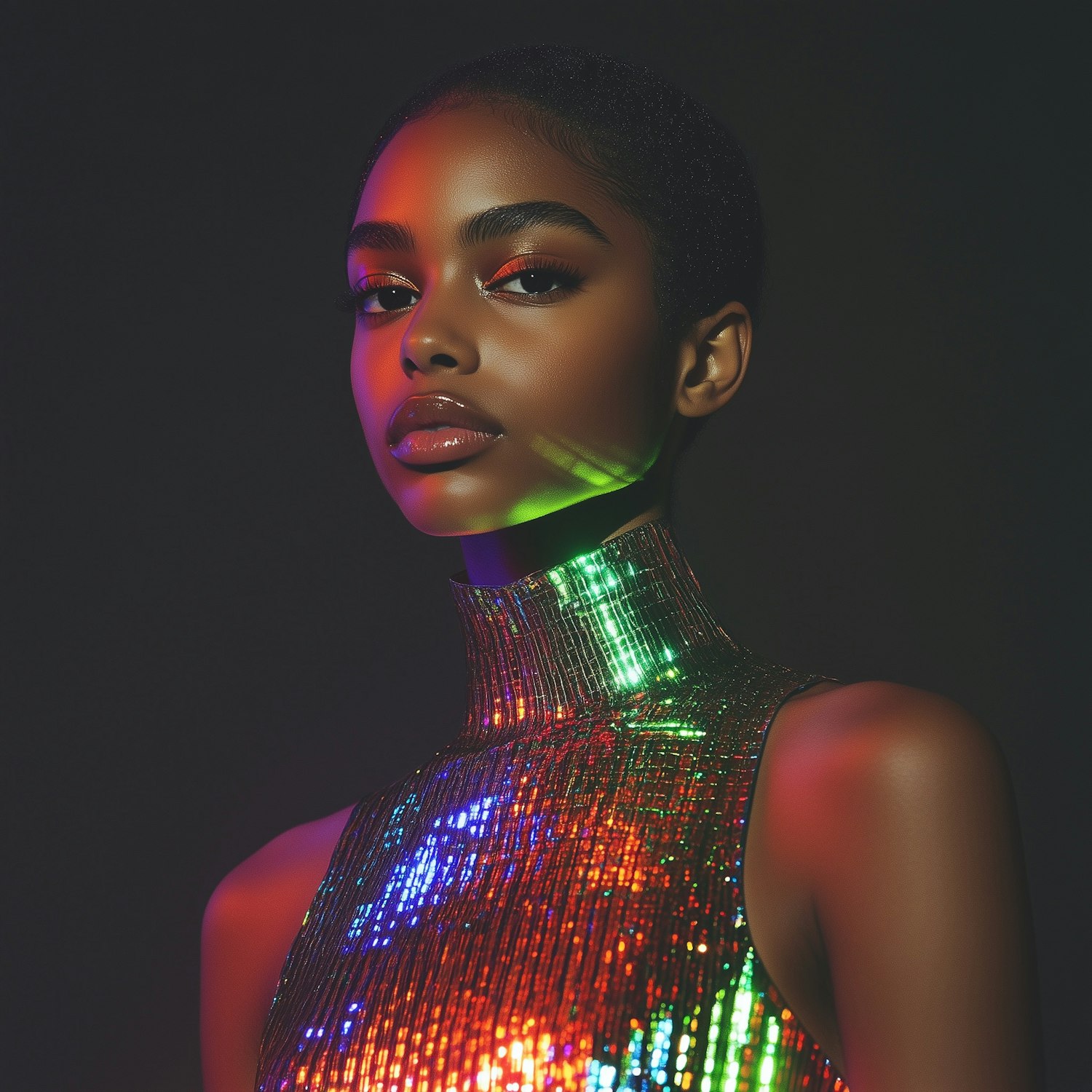 A stunning portrait of a woman in a shimmering multicolored sequin dress, bold red eyeshadow, and dramatic lighting against a dark background.