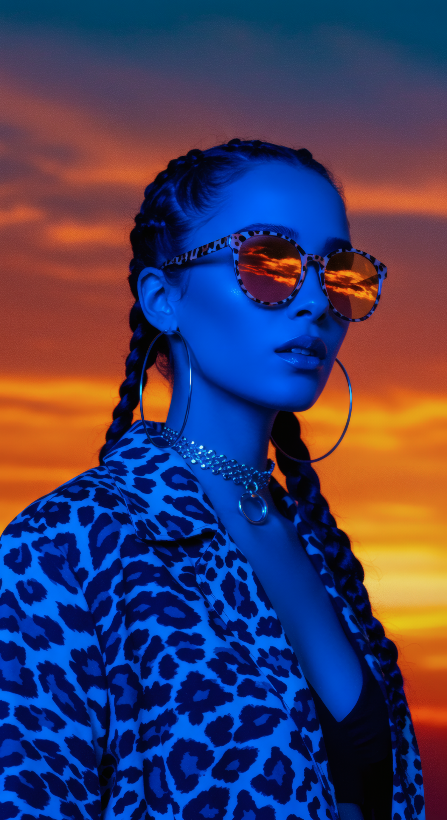 Stylish woman in leopard print with braids and sunglasses against a vibrant sunset. Blue lighting creates a striking contrast.