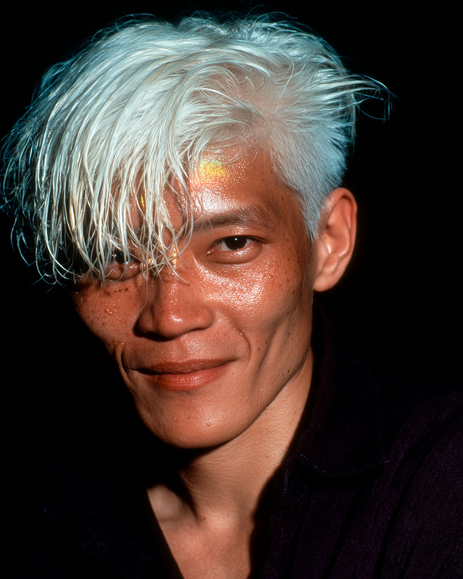 Close-up of a person with white hair and subtle smile against a dark background, showcasing striking features and vibrant lighting.