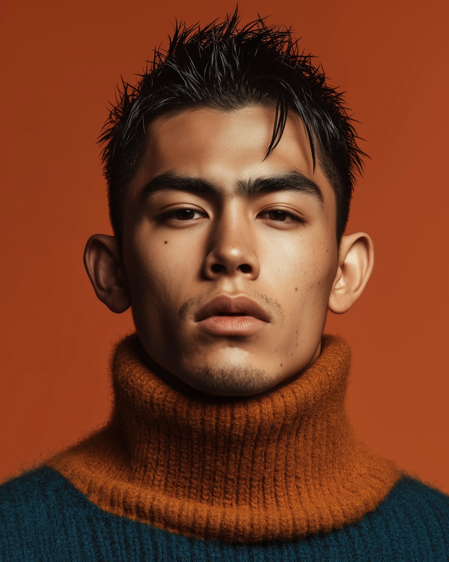 Close-up of a young man in an orange turtleneck sweater against an orange background, showcasing a bold and modern aesthetic.