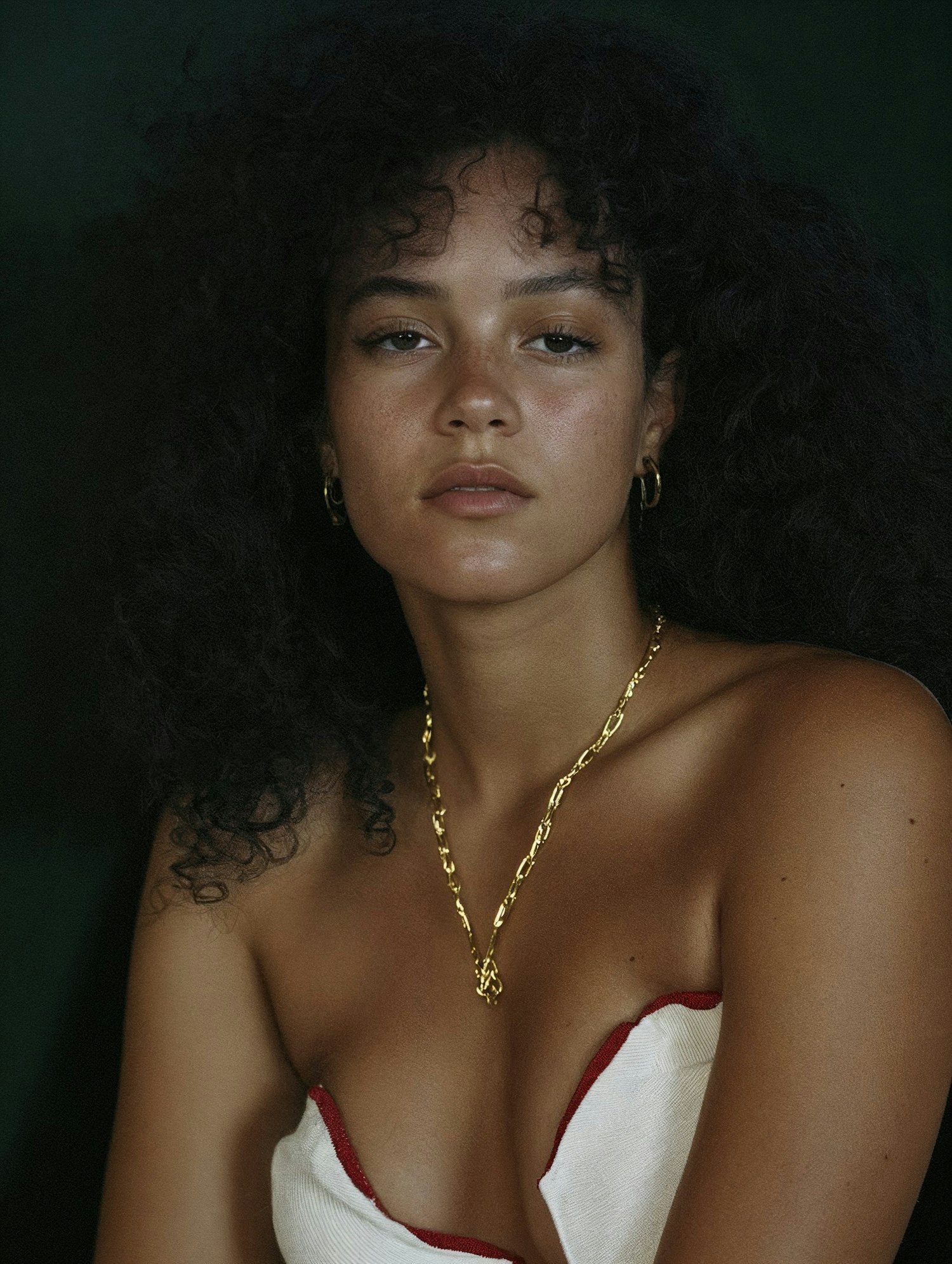 Portrait of a woman with curly black hair, gold jewelry, and a strapless white top against a deep green background.