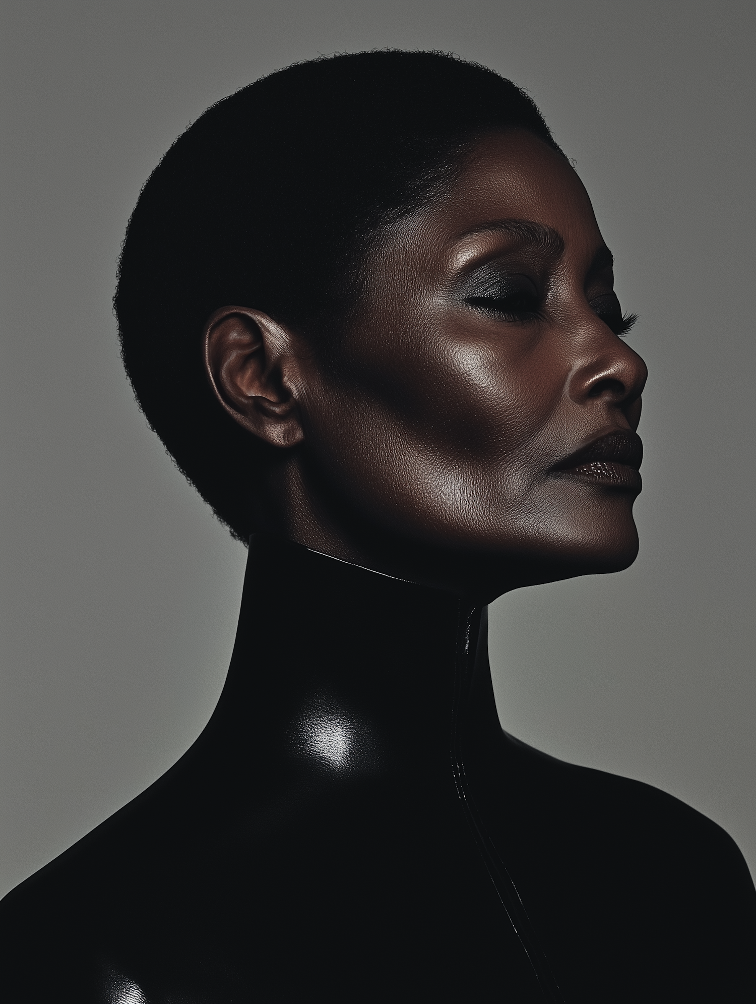 Elegant profile portrait of a Black woman in a glossy black outfit, showcasing serene expression and striking features.