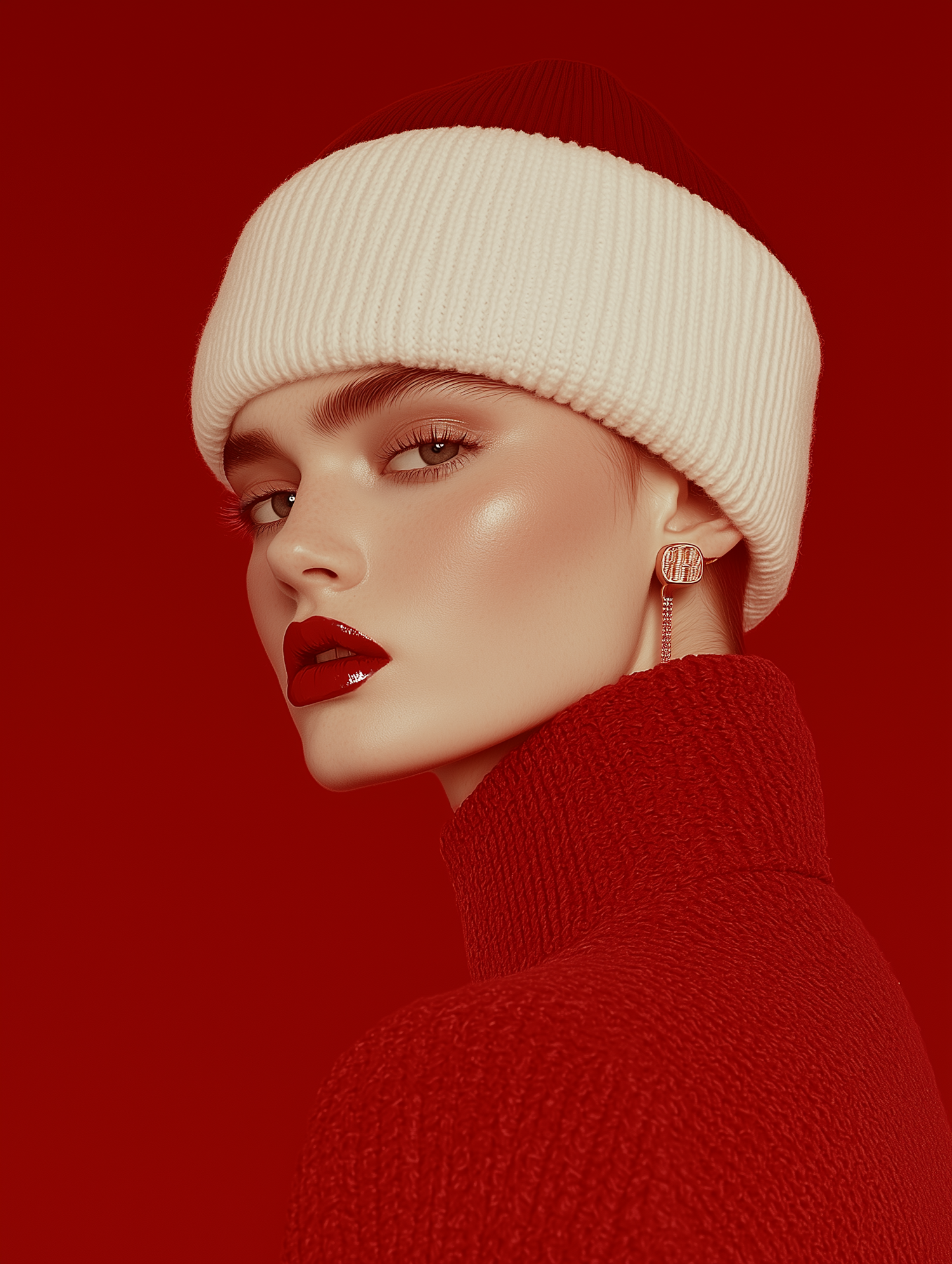 Stylish portrait with red and white tones, featuring a person in a knit beanie and turtleneck, highlighted by bold red lipstick.