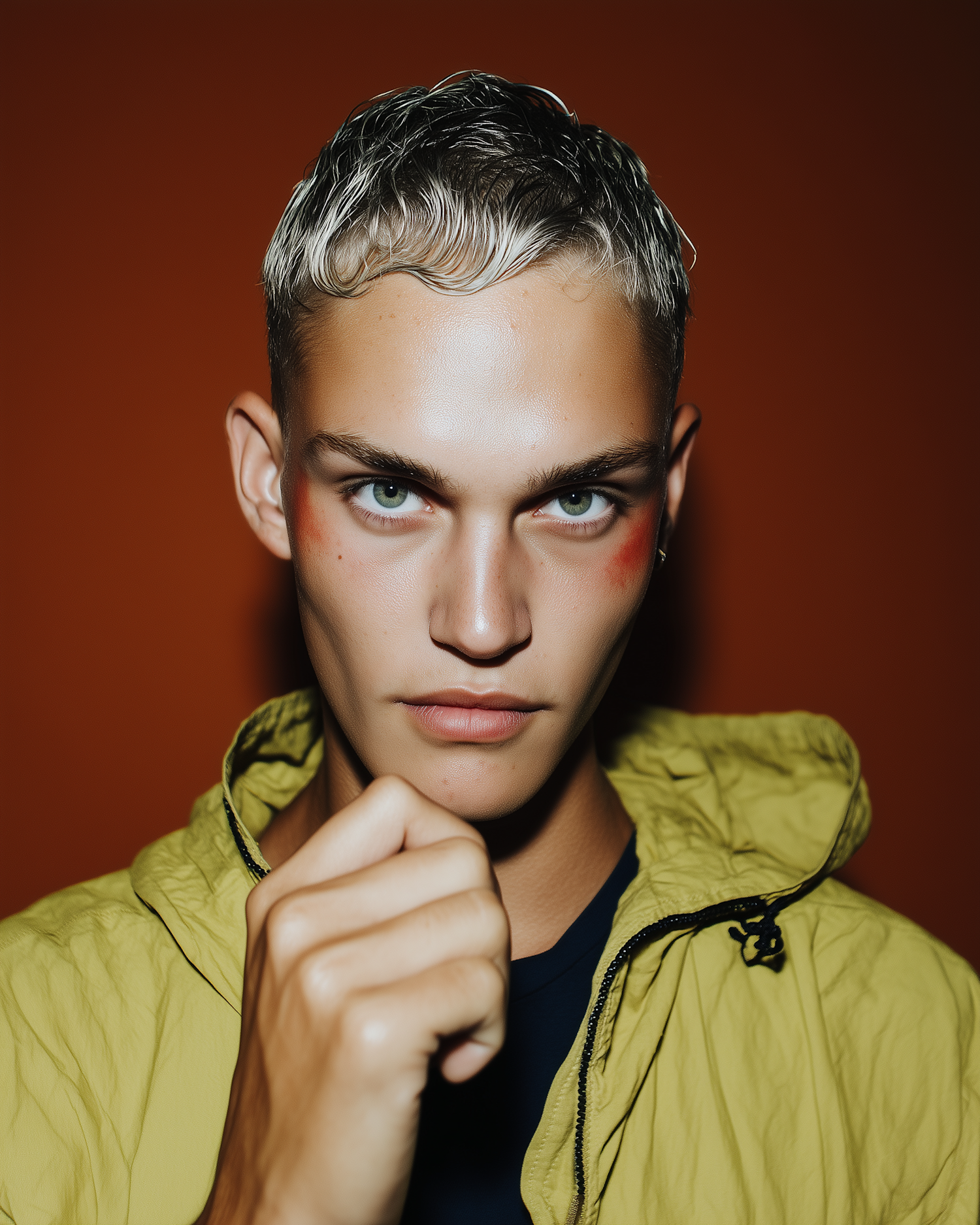 Close-up of a young man with platinum blonde hair, green eyes, and a yellow jacket against a bold orange background.