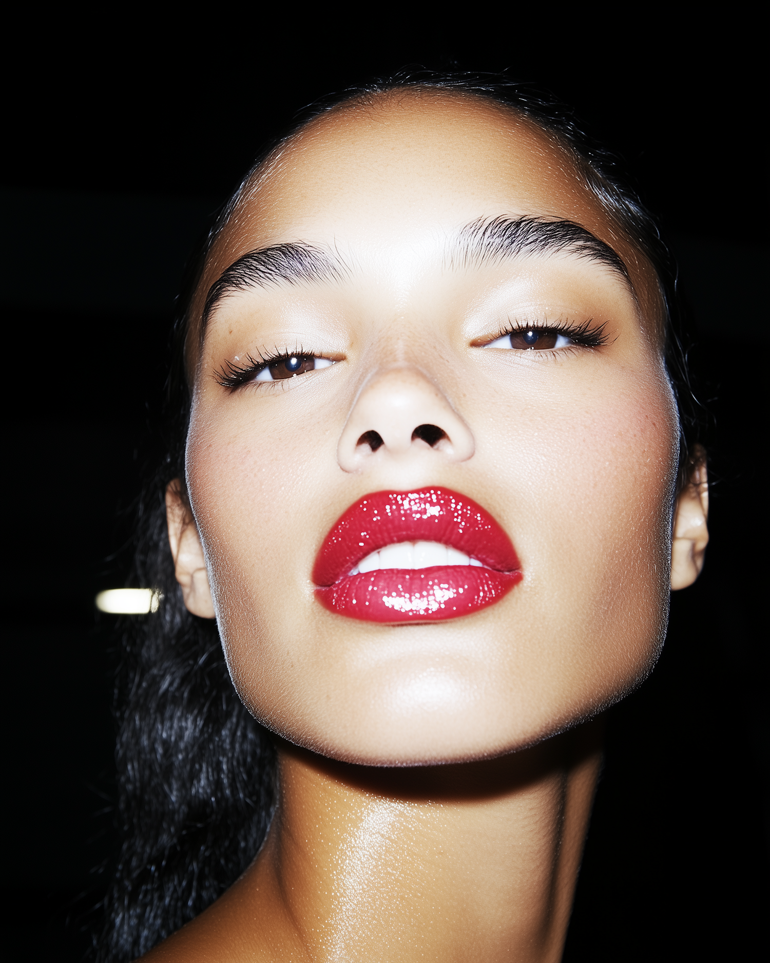 Close-up of a woman with glowing skin, glossy red lips, and sleek hair, set against a dark background for a bold, dramatic effect.