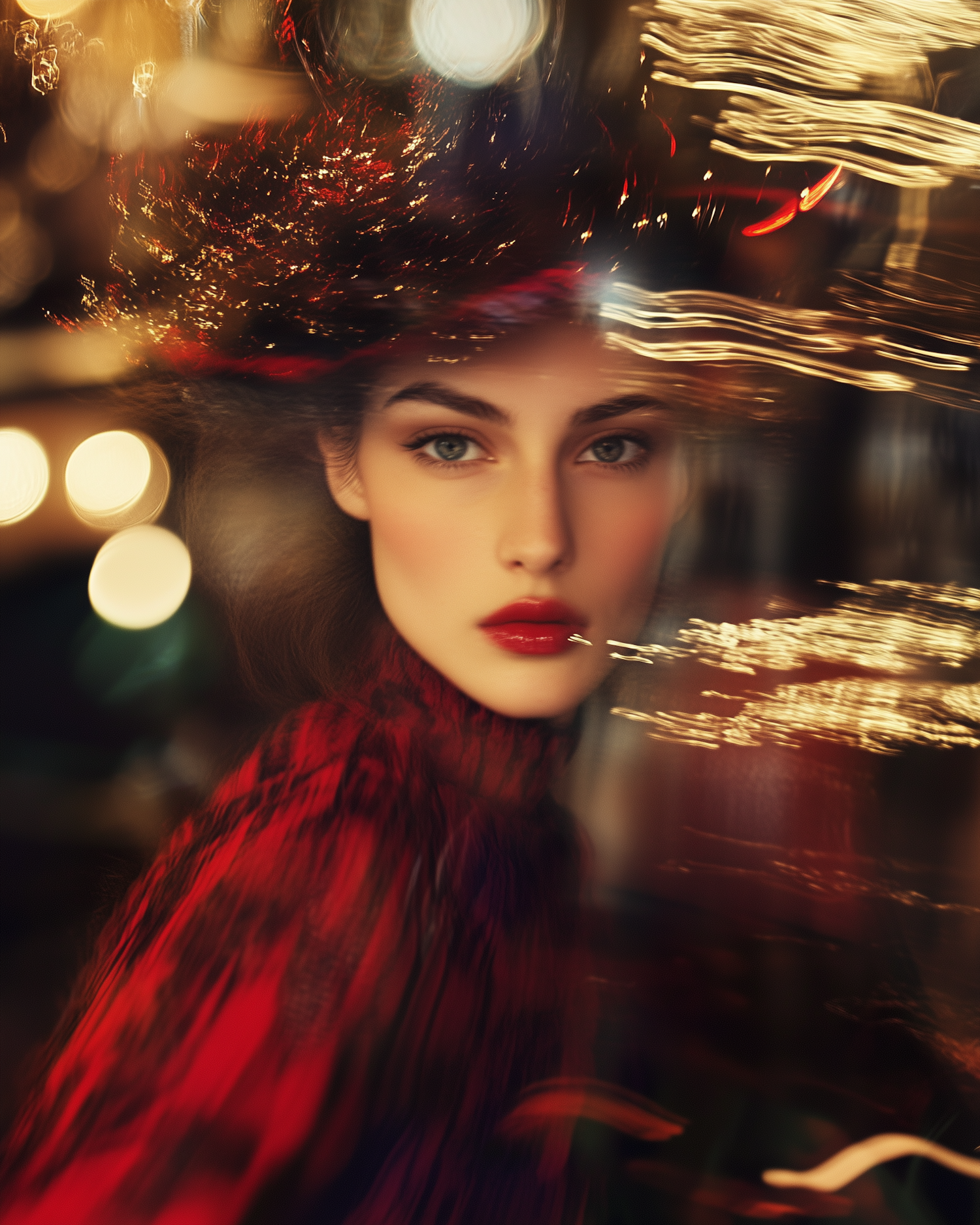 Elegant portrait of a woman in red with swirling golden lights, creating a dreamy and dynamic visual effect.