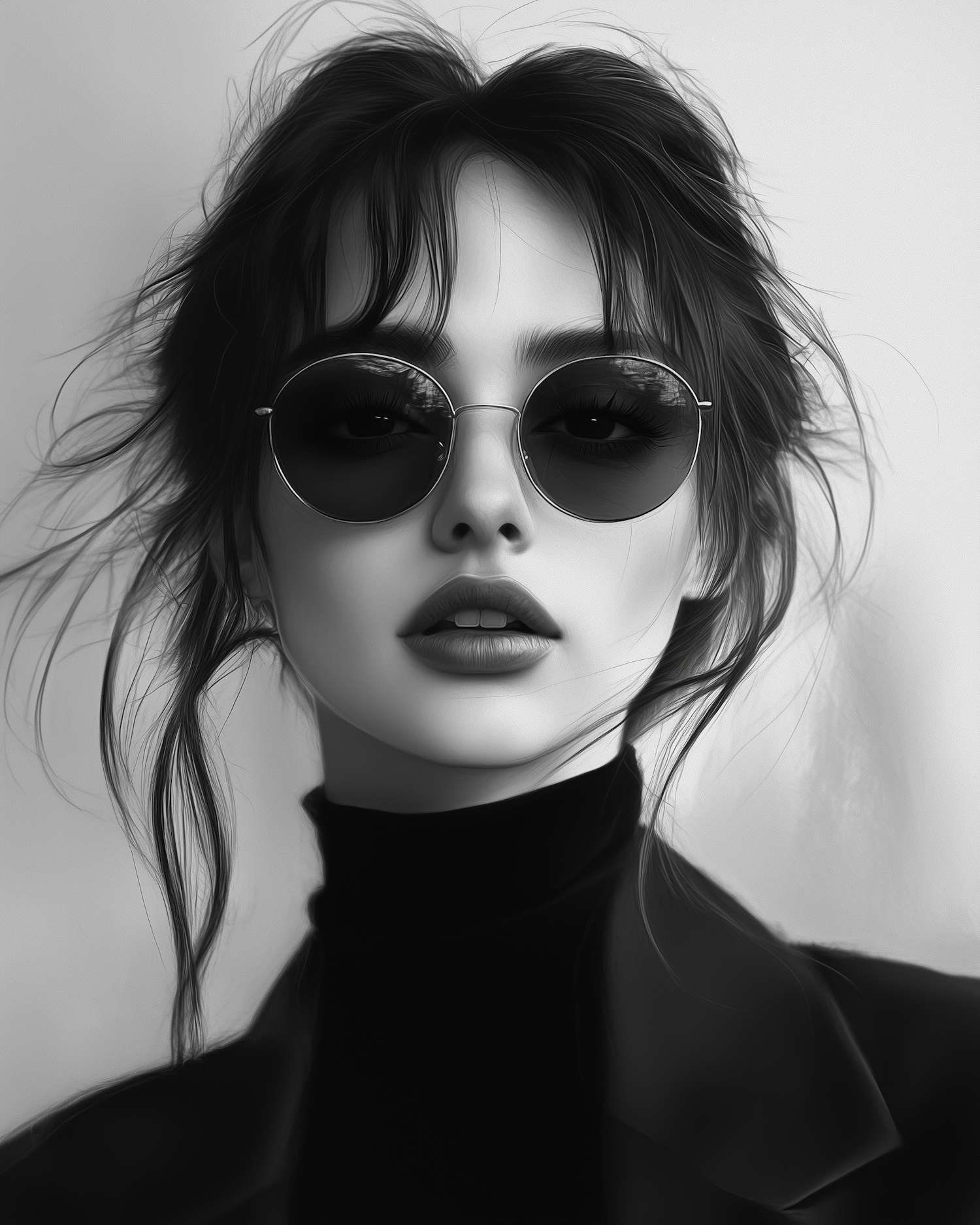 Stylish black and white illustration of a woman with sunglasses, tousled hair, and a sophisticated look.